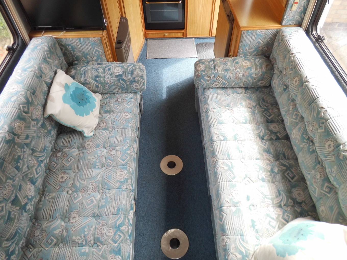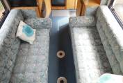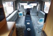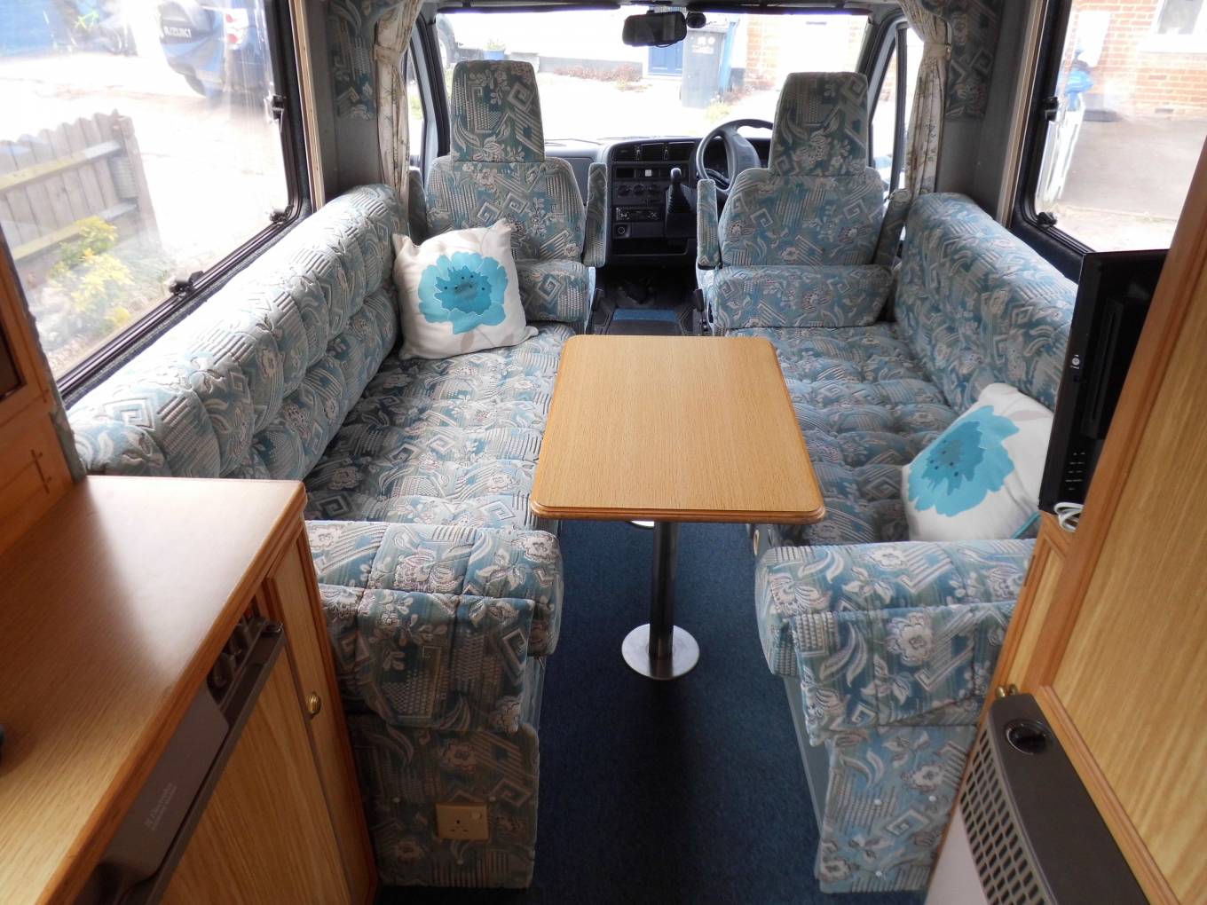 The living area consists of 2 side facing sofas each with a lap belt. The vehicle comes with 2 dining tables, one large and one small which stow away neatly. At night time these sofas can be used as 2 single beds or converted in to a transverse double bed. Above the cab there is the option of a 2nd double bed if required.