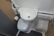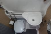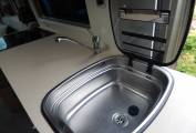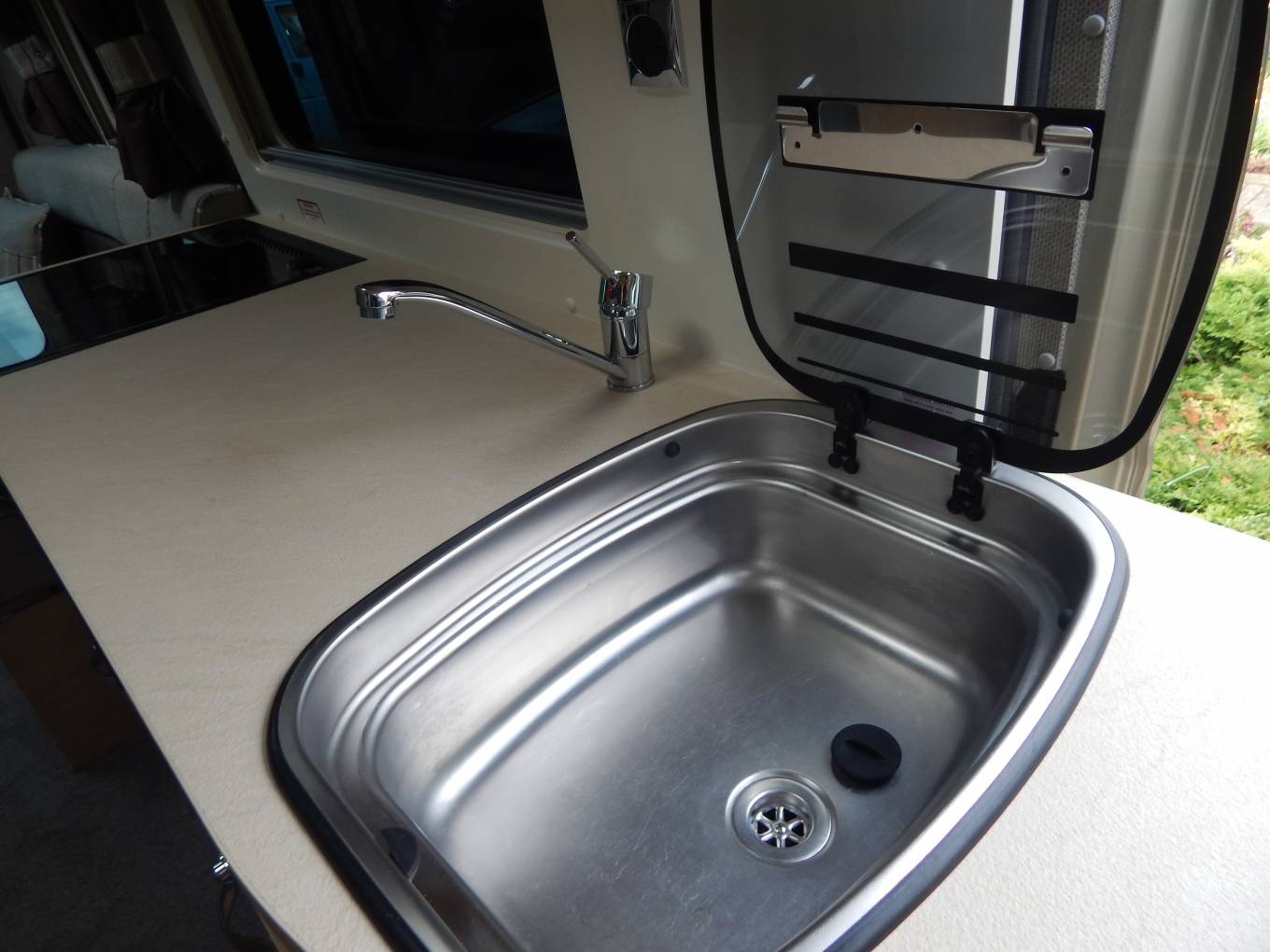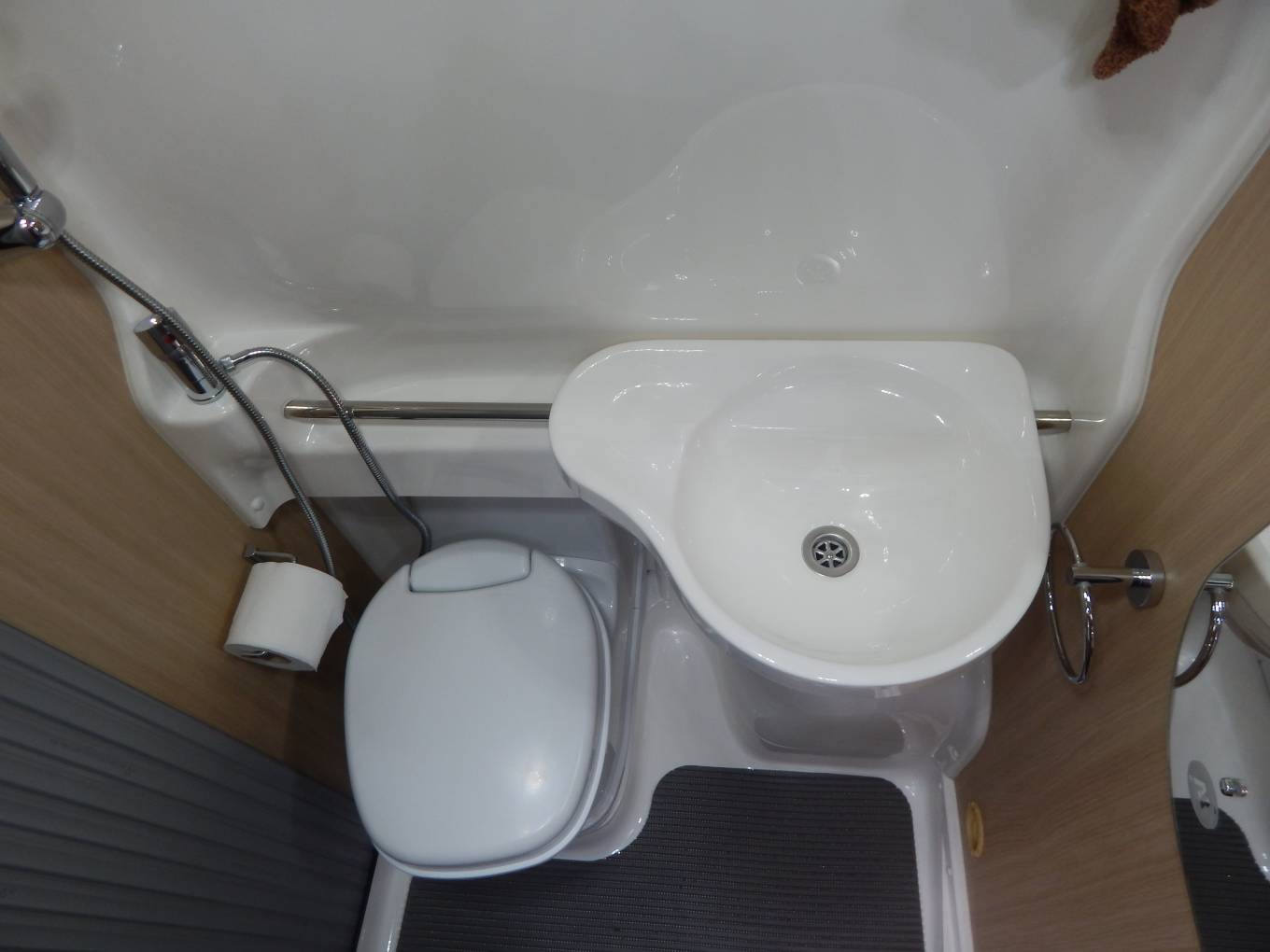 The washroom is of the wet room variant. The sink slides out of the way of the shower when it is in use. The clean water tank is around 70 litres in capacity.