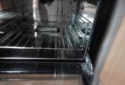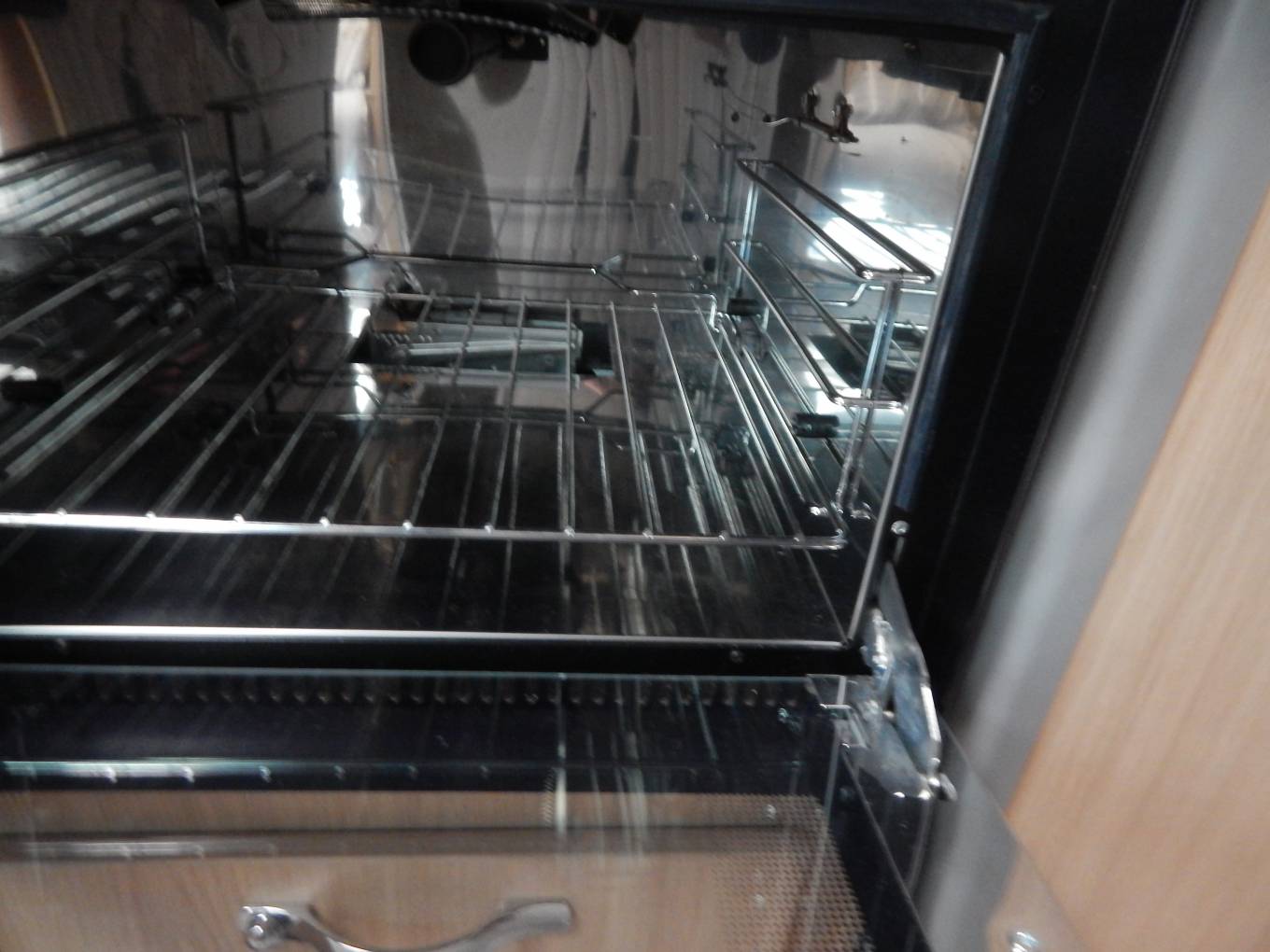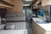 There are two dinette areas, one central the other to the rear with the barn doors with windows fitted. The forward dinette converts to a double running lengthwards and the rear one to a transverse option. There is a good amount of kitchen prep space, and the fridge freezer works on 12, 240 volts and gas.
