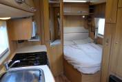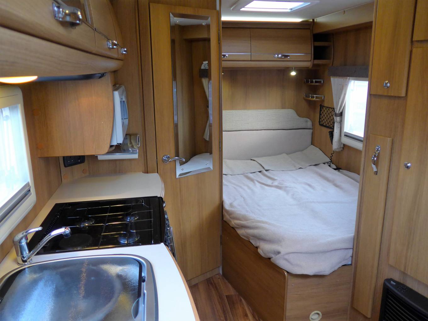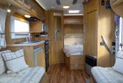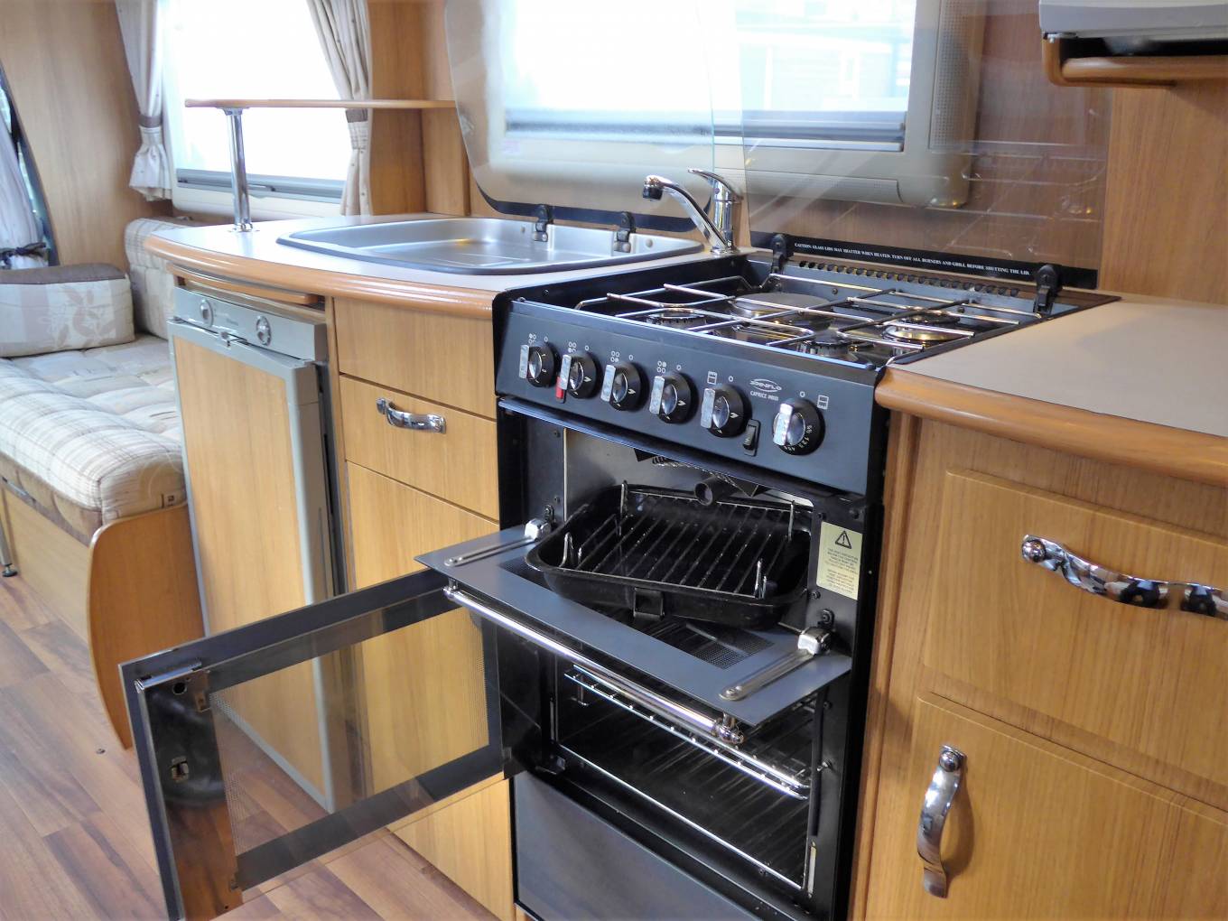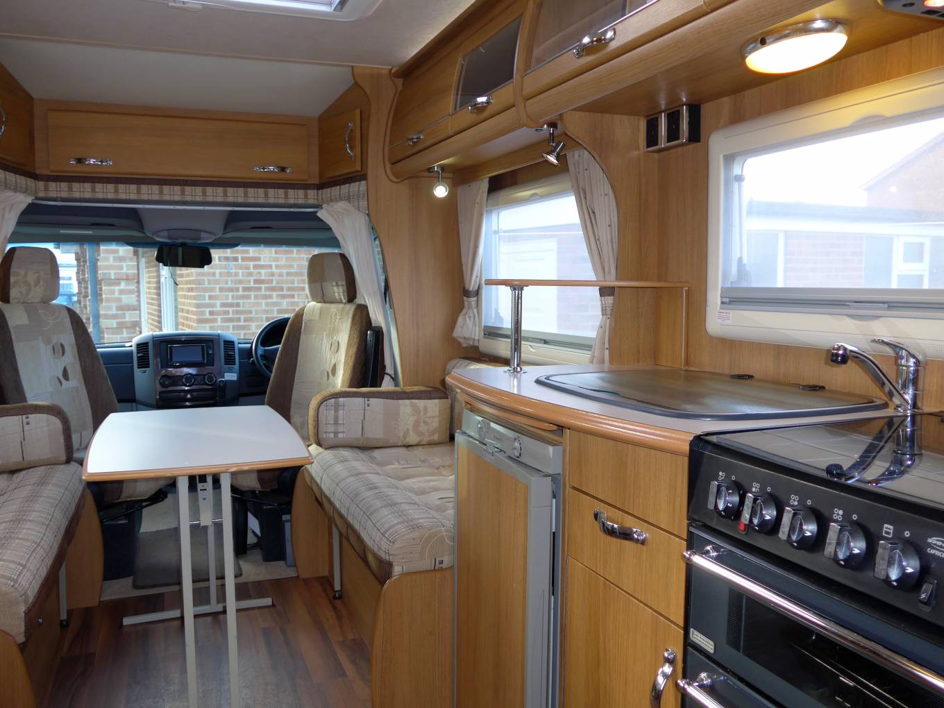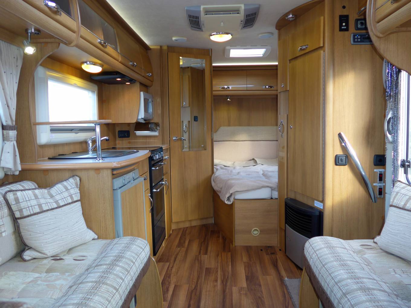 Ulitmate comfort for two people. Electrically adjustable orthopaedic fixed rear double bed. Full sized Wardrobe. Luxury corner washroom with separate shower, designer washbasin, Thetford Toilet and illuminated mirror. A spacious front lounge comprising two side sofa’s and two swivel captains and a foldaway large dining table which providing dining in comfort for up to six adults. This area converts in to a large transverse double bed. Fully equipment kitchen with dual-fuel hob, oven, grill, extractor fan, 3 way Fridge and a 230v microwave.