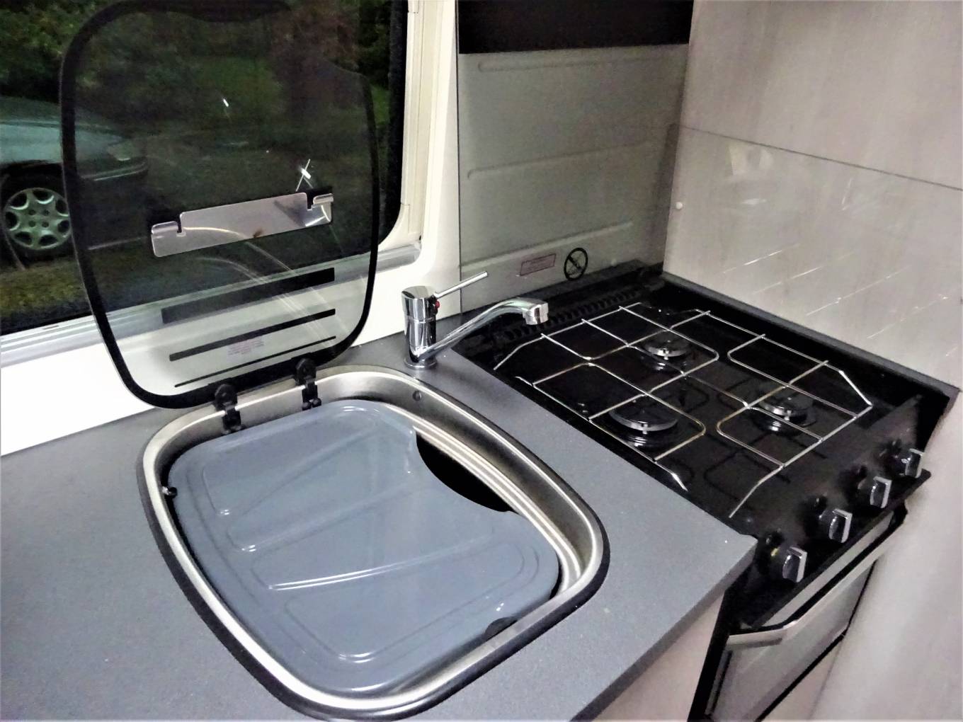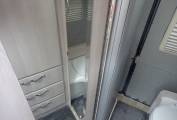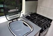 Decent prep space to kitchen. Fold out table stored in washroom and single pedestal table in wardrobe. Thule Omnistor awning, and additional Vango drive-away awning included in the asking price.
