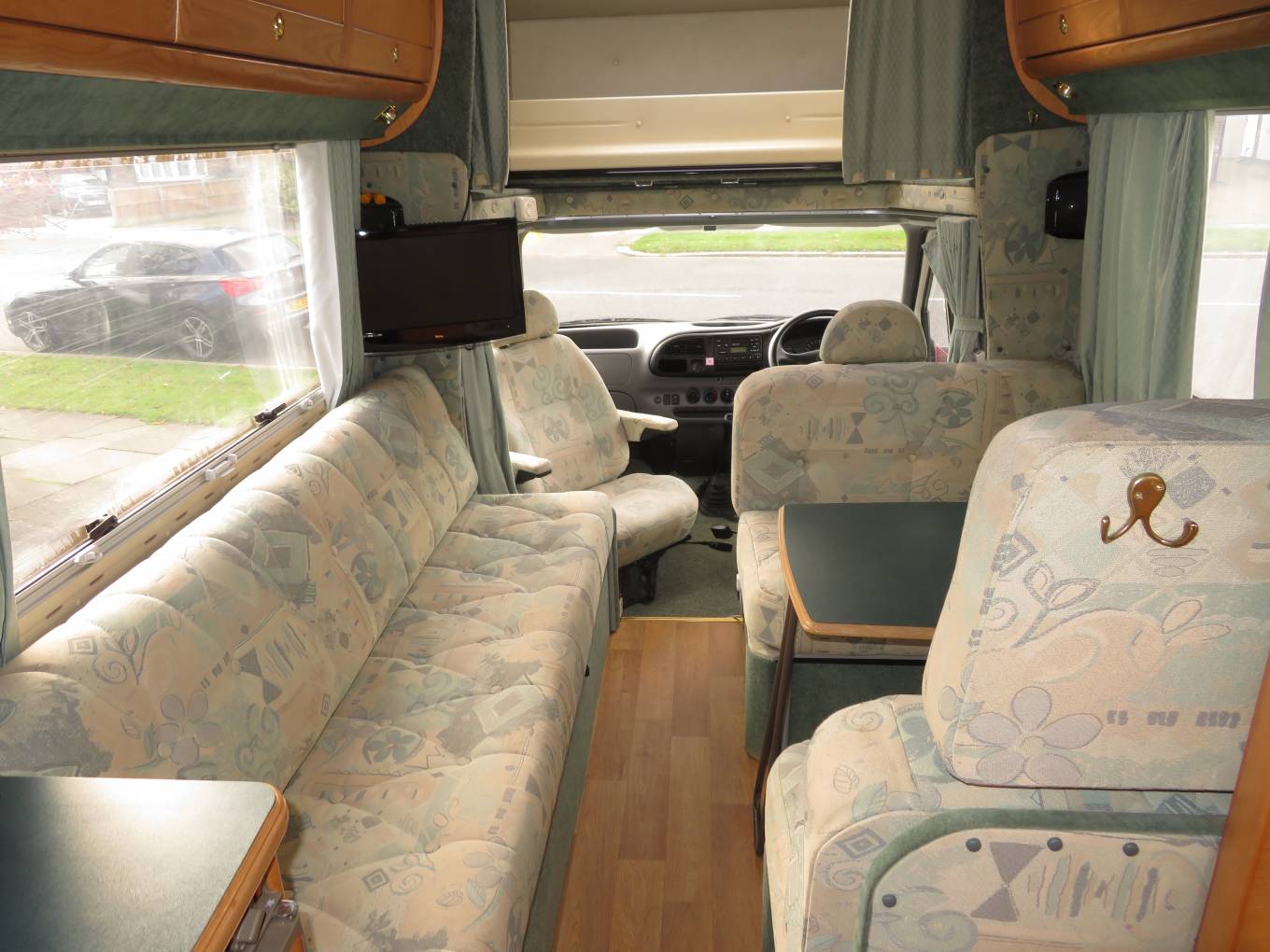 The motorhome is in lovely condition inside and is based on the bench sofa and central dinette layout. As the passenger seat swivels, you can create a wonderful area to put your feet up, relax and enjoy a good book or a glass of wine or watch the TV and DVD if you so wish. The dinette table is ideal for up to four people and the perfect place to enjoy a meal or snack. The Pollensa has good sized windows which allows the natural light to flood into these areas.