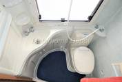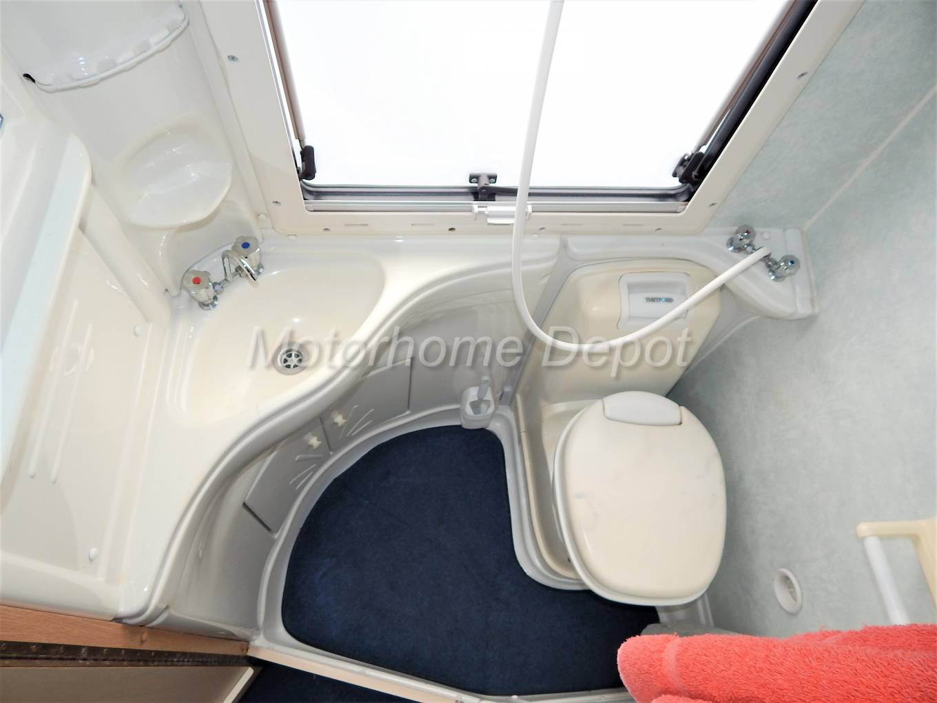 We enter the motorhome on the passenger side immediately opposite is the all in one bathroom which consists of a Thetford cassette style toilet with a swivel head; built in white sink with chrome mixer taps; the shower has its own mixer with fixed shower head, and a shower curtain to keep the area dry. moving rear is a large hanging wardrobe which also stores the main table & chrome legs. There is a booster box for the aerial.