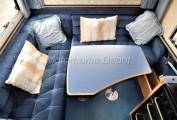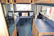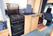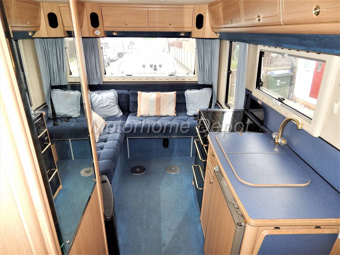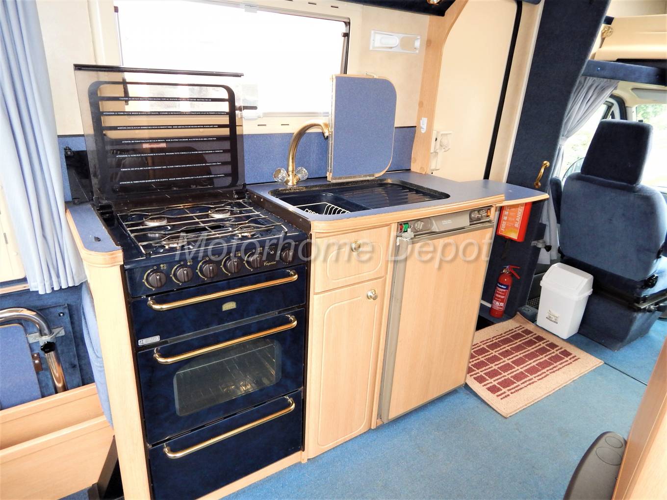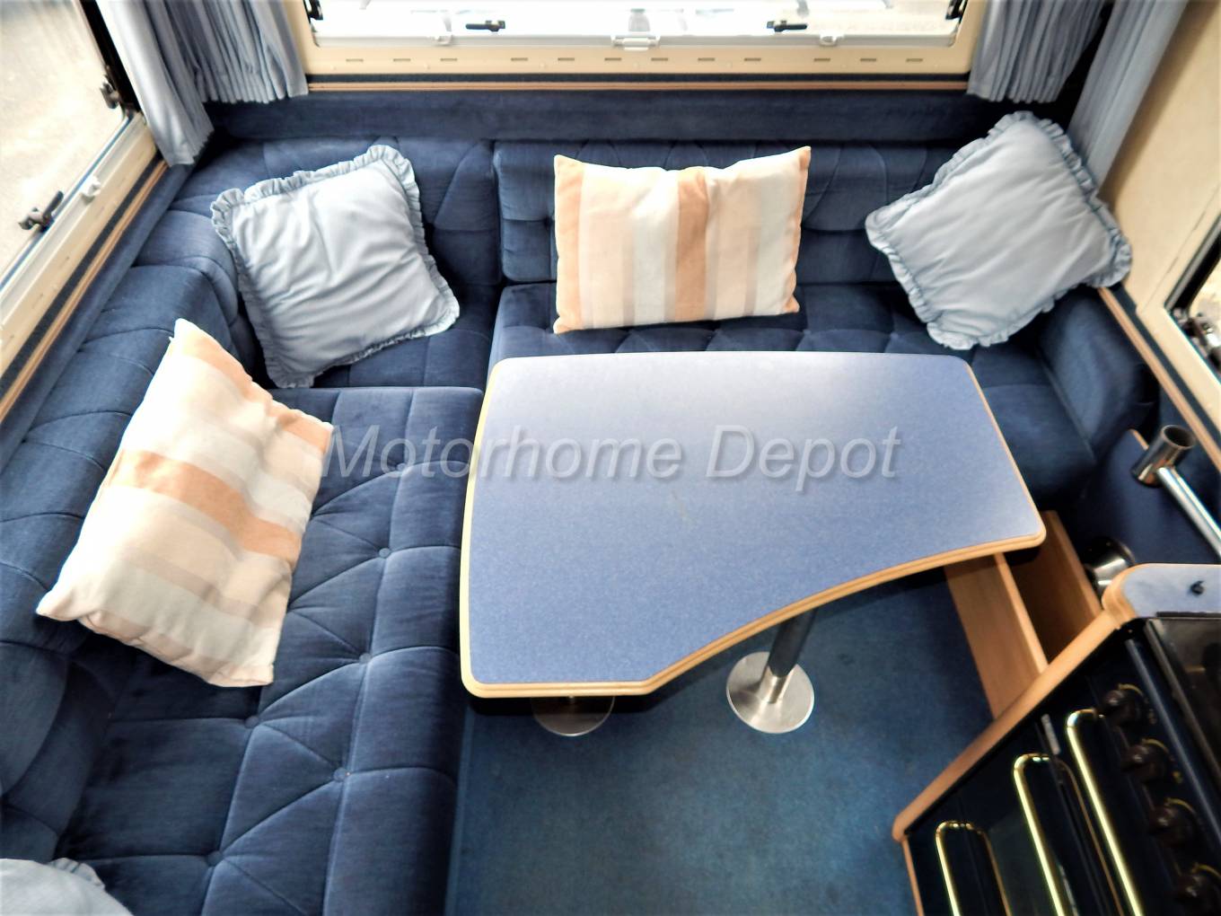 To the right of the habitation door is the galley style kitchen which has an extendible leaf to create extra worksurface there is also a cover over the sink which can be retracted whilst in use. The sink & drainer are in a blue enamel with a gold mixer tap, under the counter is an absorber style fridge with freezer box that can be powered by: 240v, 12v or gas depending whether you are plugged in on site or wild camping. To the left is a full sized Caprice oven & grill with a four burner gas hob.