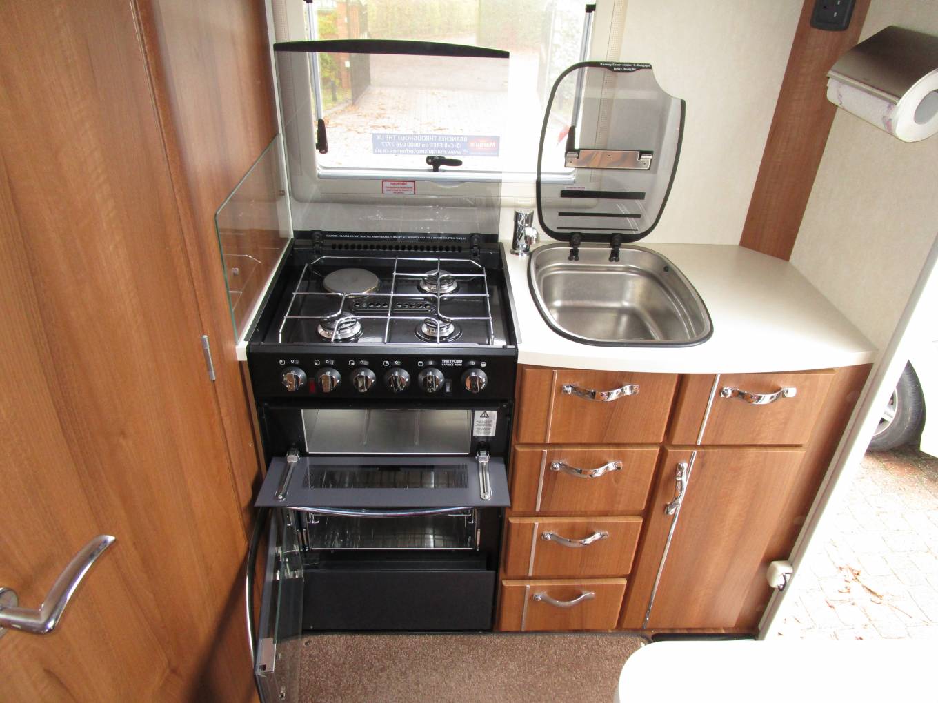 The kitchen is located to the rear of the vehicle and comes fully equipped with hot and cold water, sink, 3 ring gas burner and single electric hob, separate oven and grill and microwave. All appliances are in excellent condition and there is adequate storage. Adjacent is the washroom comprising of Thetford cassette toilet, sink and integrated shower.