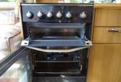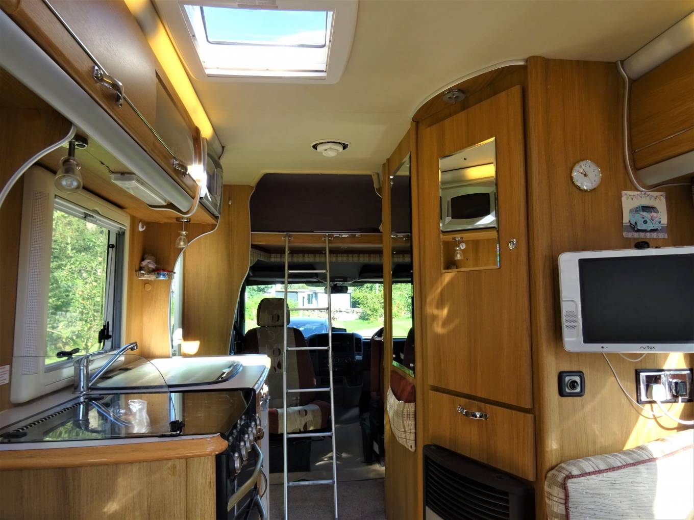 The second double bed is situated above the cab, with a section folding down when in use to make up another good double. It is accessed using a folding aluminium ladder that stows in the bed when not in use. It has a safety net available from under the bed for children.