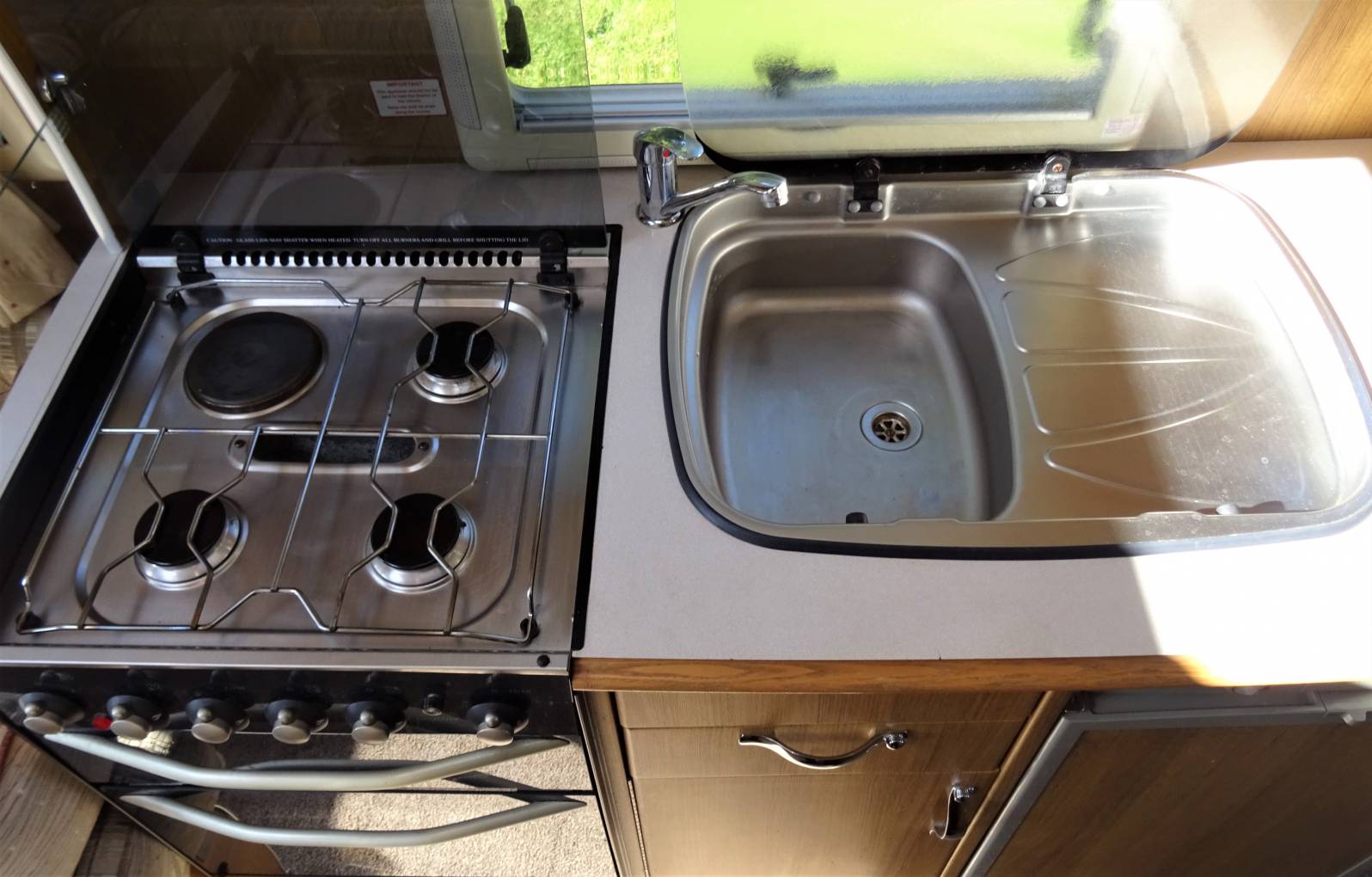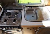 As you enter the motorhome via an electric step with the kitchen immediately on your right, it consists of a dual fuel hob that has three gas burners and an electric hotplate, an oblong sink & drainer and mixer tap, a full gas oven and grill plus built-in microwave above. The area is really well designed with a couple of extra worksurfaces that stow out of the way when not in use.