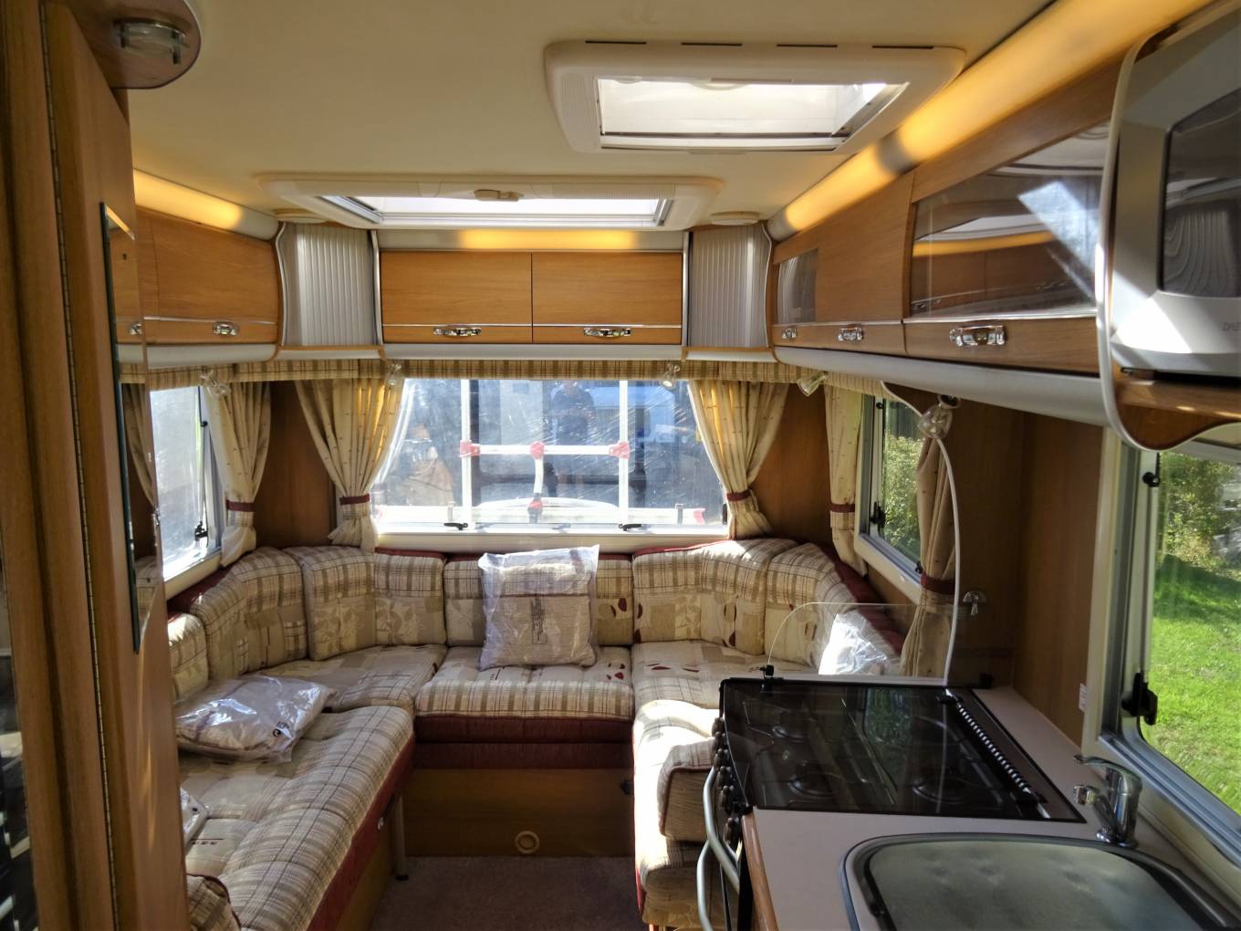 The massive lounge is situated to the rear of the motorhome and has sofas in a u shape with 2 large sunroofs and windows all around which floods the area with natural light. There is a Avtex TV mounted on the offside. The table neatly folds away into the wardrobe for travelling.