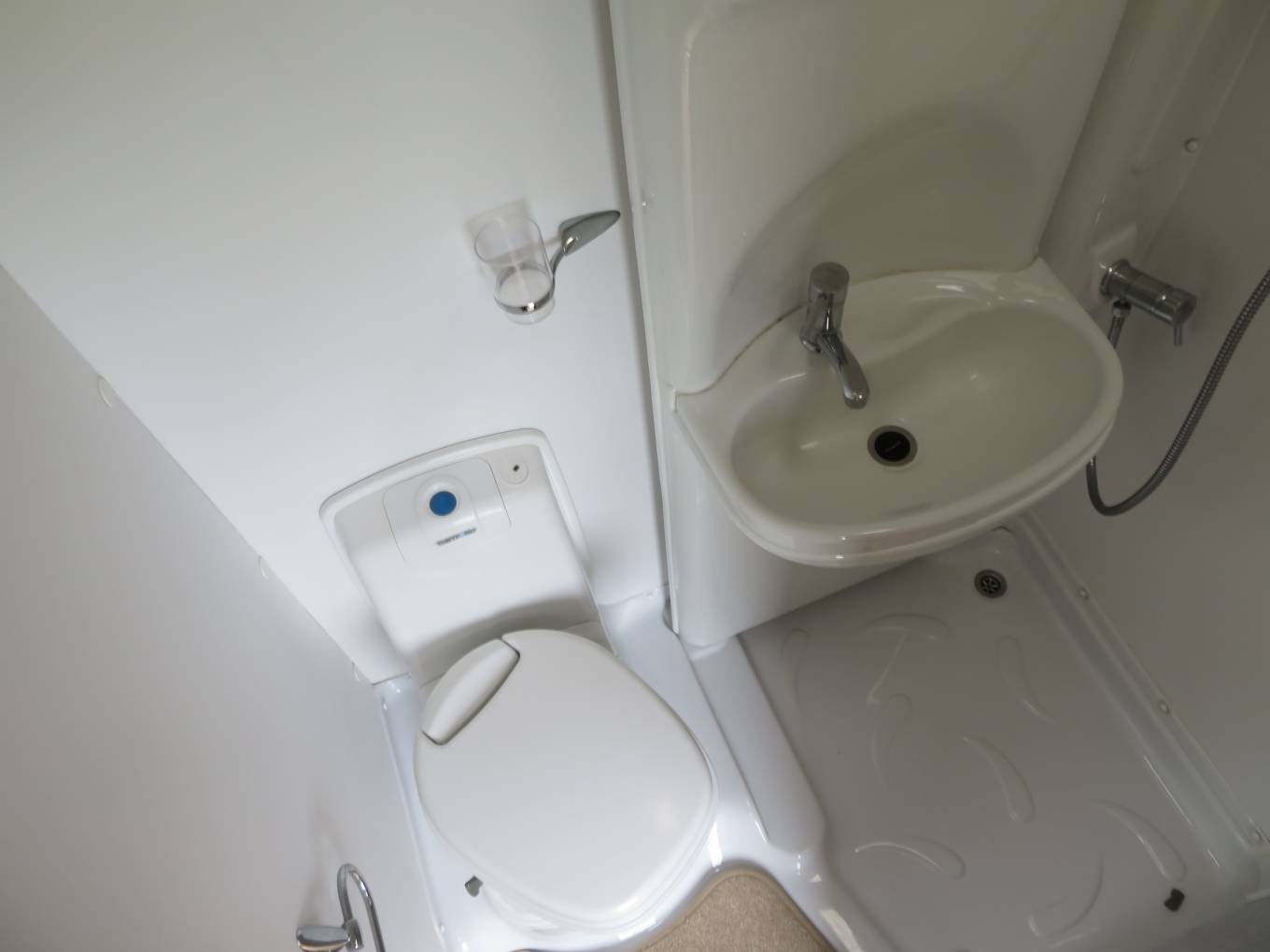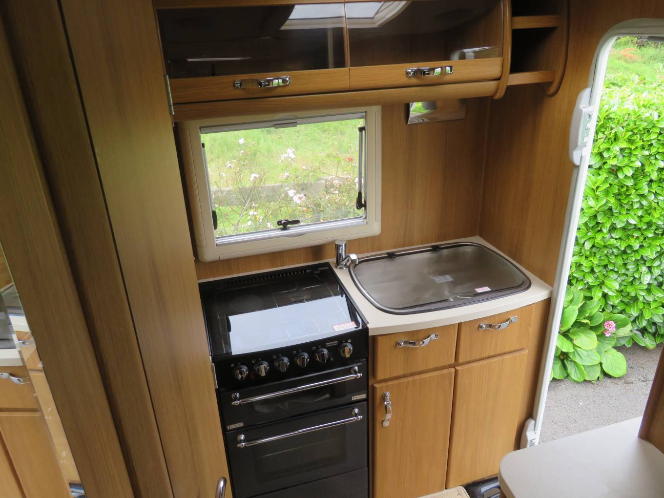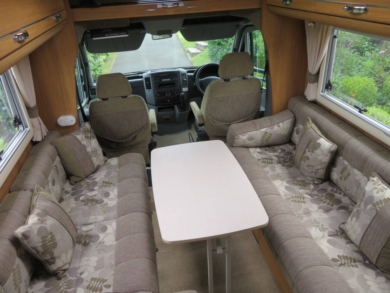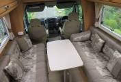 At the front you have a large double overhead cab bed, you then have a lovely L shaped front lounge area it which to relax in with a choice of tables, this area also converts to a double and a small single if needed. At the rear you have the Kitchen area and opposite the side opposite the habitation door is a very well appointed washroom.