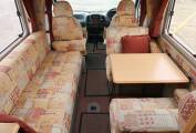 The centrally located lounge dinette is one of the standout features of this campervan. If you enjoy meal times or just relaxing with a drink after a day out then this campervan and its large lounge is for you. There is a forward facing 2 seater sofa fitted with a seat belt, a rear facing 2 seater and a large side facing sofa so you could sit 6 people around the table if you so wished. At bedtime the rear and forward facing sofas convert into a double bed and the side sofa could be used as a single bed. Alternatively you can combine them all together to make up a large double bed. The other 2 sleeping berths are in the double bed above the cab.