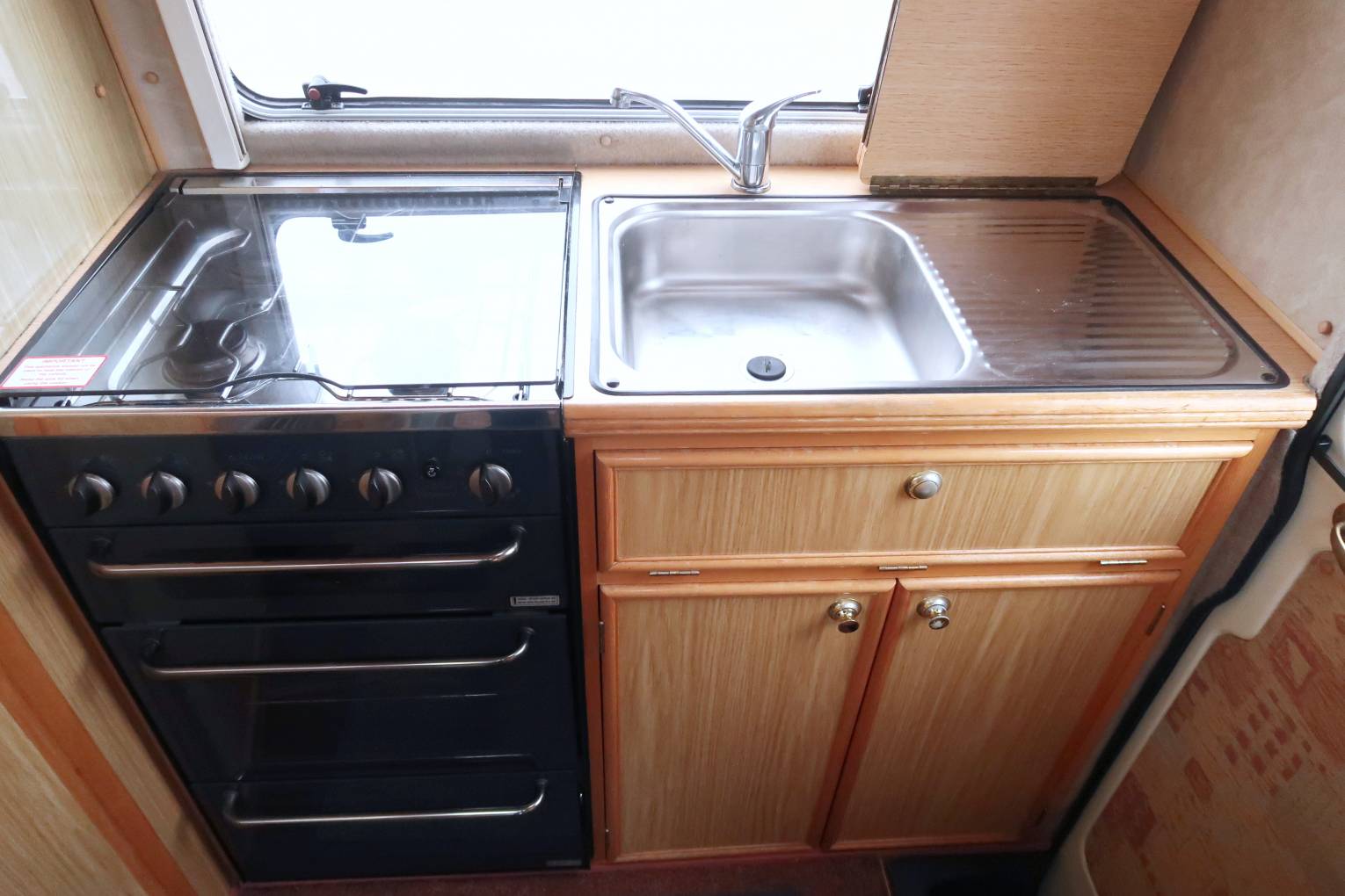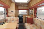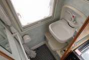 On entering the campervan the first thing that strikes you is how spacious and roomy the vehicle feels and there is plenty of headroom. The layout consists of an end kitchen which is fitted with a gas oven and grill, a 4 gas burner hob, a 3 way fridge with an icebox and a sink with a mixer tap. Close to the kitchen is the washroom and this has a shower, a Thetford cassette toilet, a fold down wash basin with a mixer tap, a mirror and a bathroom cupboard for your toiletries. A large window ensures that you have loads of light to get yourself ready for the day ahead.