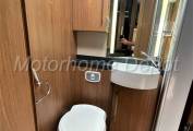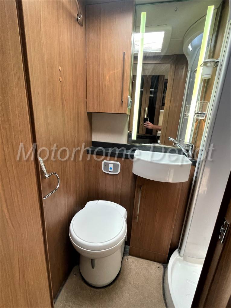 The bathroom consists of a Thetford fresh water flush cassette style toilet with a swivel top, there is a white sink with chrome mixer tap with built in cupboard. The shower is a separate cubicle which has Perspex doors to close.