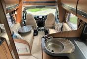 We enter the motorhome on the passenger side immediately to the left of the habitation door is the lounge area which consists of two opposing two seater sofas. The front seats rotate to join this area and there is a removable table that stows in a rear cupboard when not in use. You could easily seat 6 people if entertaining on site. There is also an occasional table that sits by the front seats ideal for a coffee break. At night this area makes into a double bed by pulling the sofas together and using a combination of sofa cushions as the mattress.