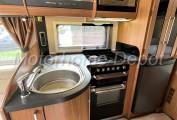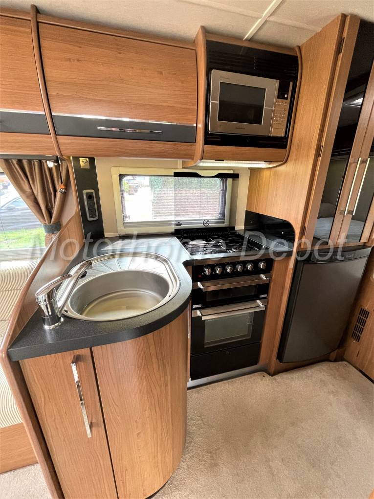 Moving rear is the kitchen area which consists of a 4 ring black enamel hob, 3 gas burners and one 240v hot plate that can be used when plugged into the mains on site. Underneath is a full size oven and grill. The sink & drainer are finished in brushed metal with a chrome mixer tap. To the right is a hanging wardrobe with Dometic 3 way absorber fridge with freezer box below, this will run on 12v; 240v or gas depending whether you are plugged into the mains or wild camping. There is a Microwave above & plenty of cupboard space for all your cooking utensils.