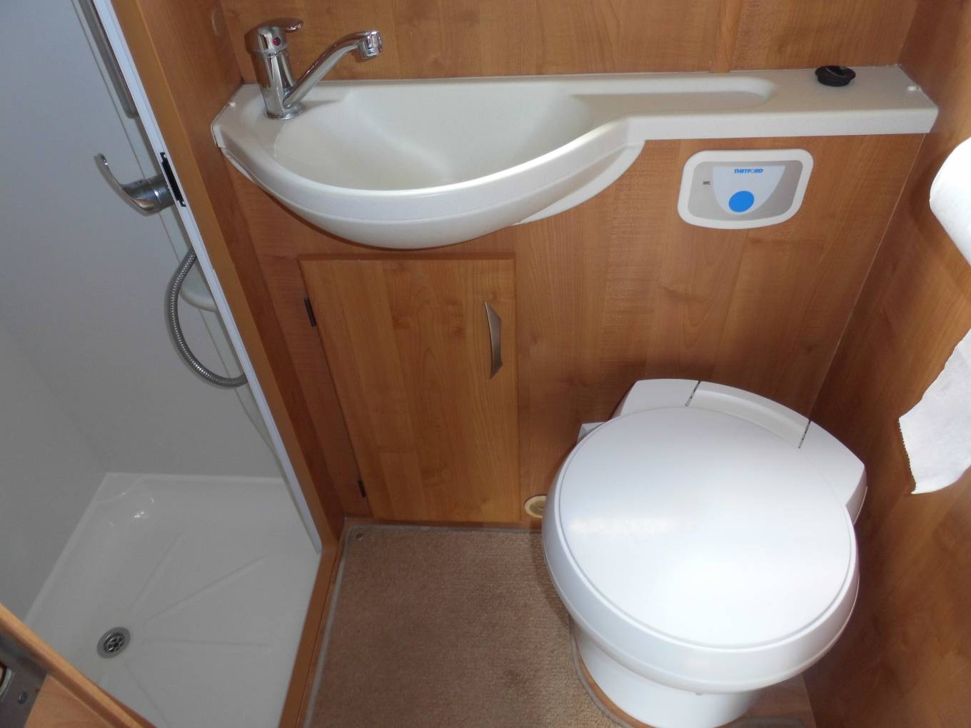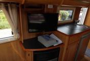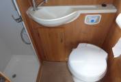 Forward of the kitchen is a large wardrobe opposite the well planned washroom which has the luxury of a separate shower. Both cab seats swivel and above the cab is a large double bed with ladder, which can double up as storage for bulky items.