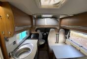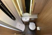 Across the centre of the motorhome on one side is the wardrobe above the Truma gas and electric heater. On the other side is the bathroom containing a Thetford cassette toilet, a wash handbasin, a separate show cubical and many cupboards.