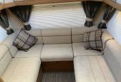 The rear of the motorhome is taken up by a spacious U shaped lounge where the fitted TV DVD pulldown from behind the overhead lockers.