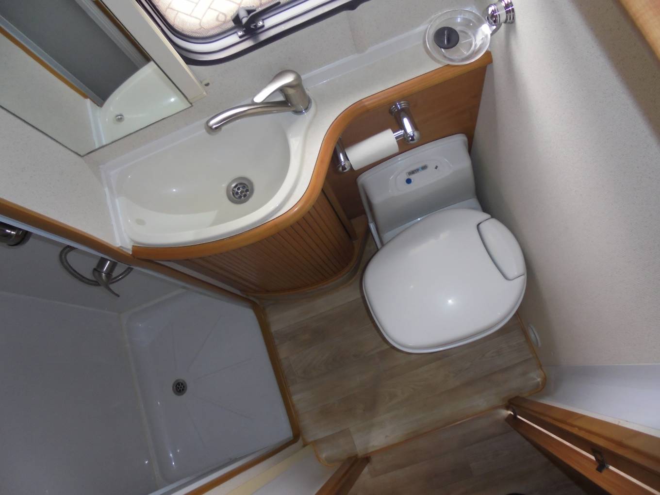 Thetford cassette toilet, vanity wash basin, medicine cabinet, separate shower