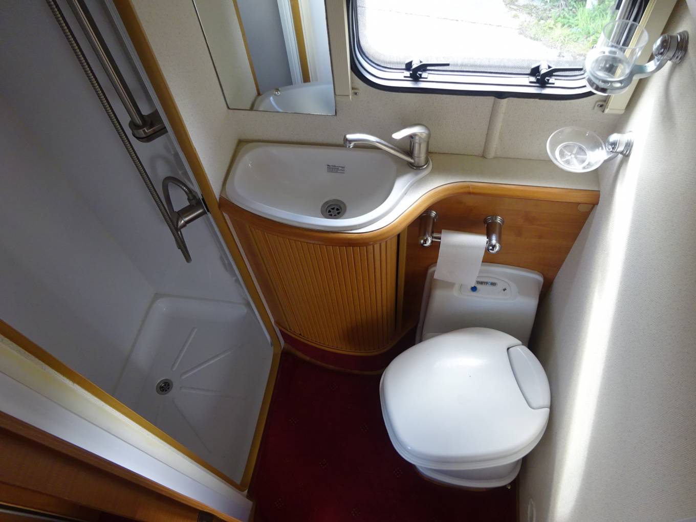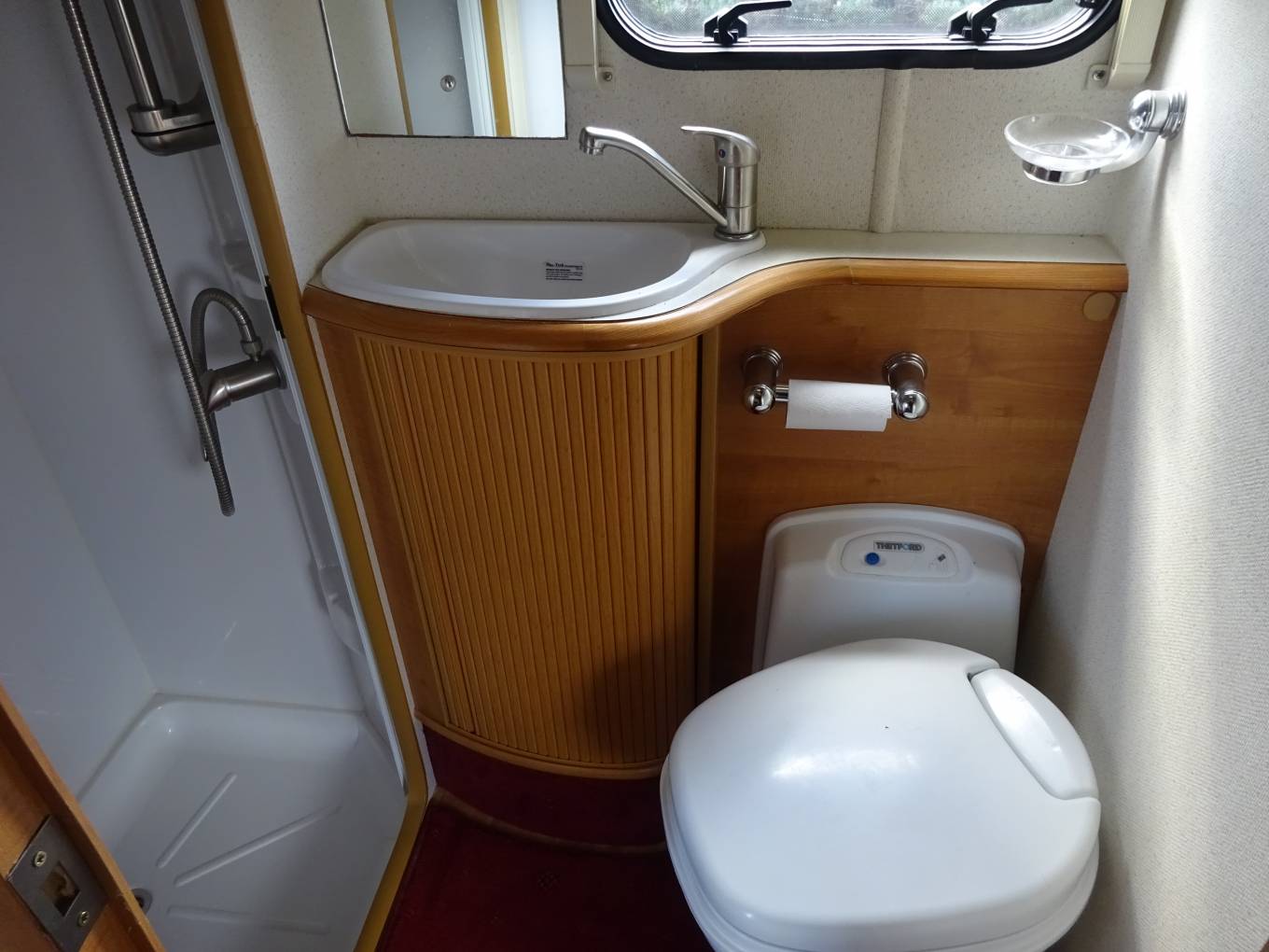 Washroom has a separate shower cubicle, cassette toilet and vanity basin.