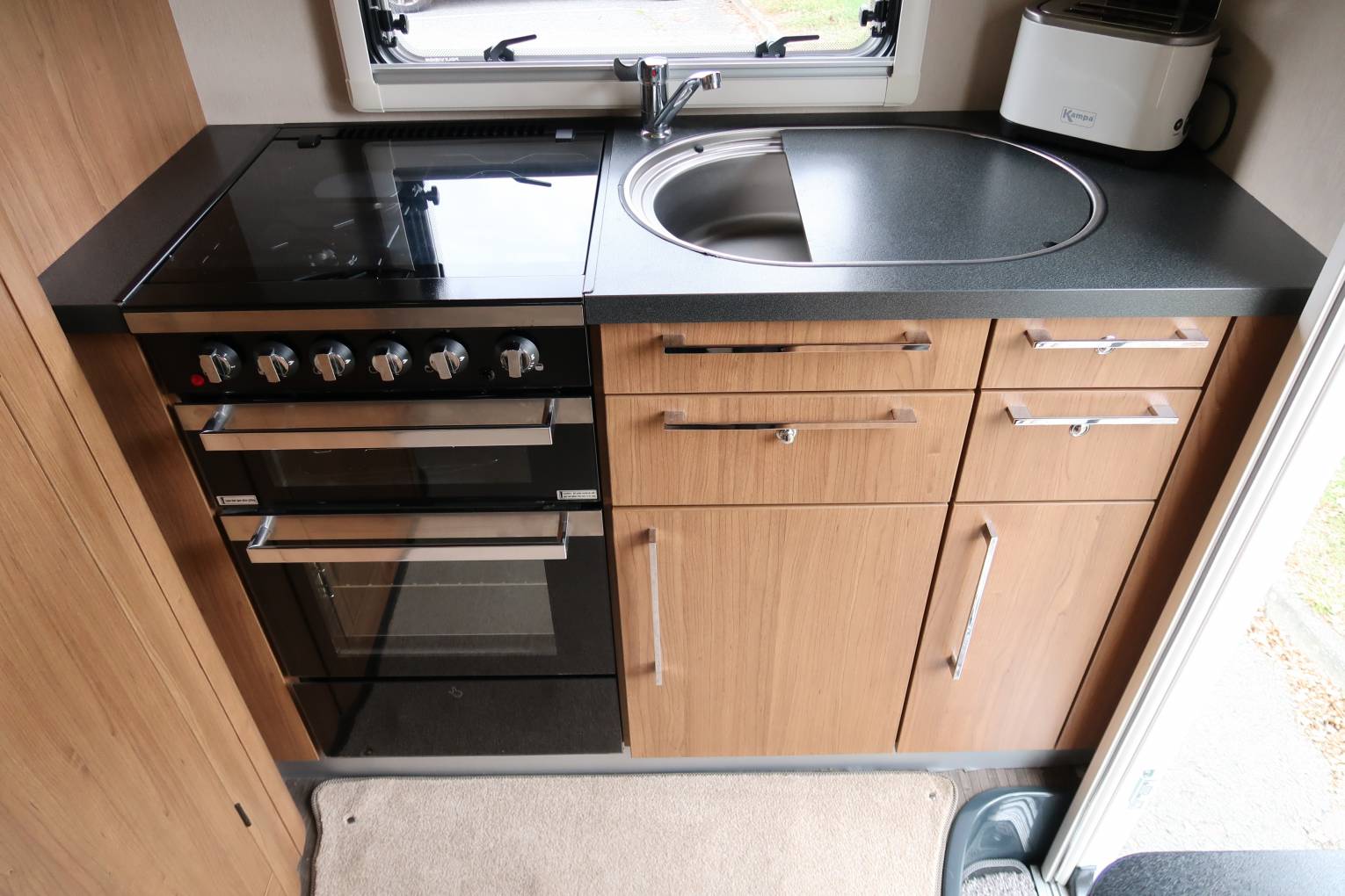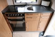 Take a step inside the vehicle and you are immediately blown away by the spacious interior and the fantastic layout. The end kitchen is impressively equipped and has all the facilities you could wish for. There is a 3-way fridge, a gas oven and grill, a dual-fuel hob with an electric hotplate and 3 gas burners as well as a microwave.
