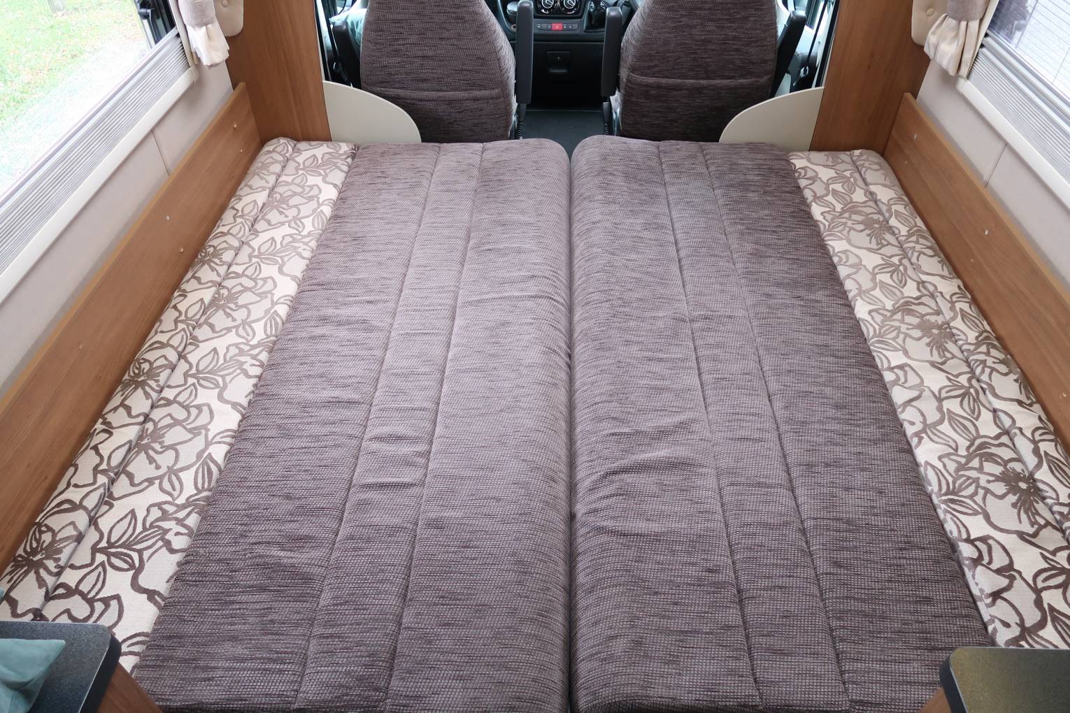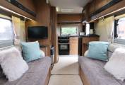 Possibly the standout feature of this wonderful motorhome is the hugely impressive lounge area. After your day's activities, what better way to relax than to sprawl out on one of the long side facing sofas with a good book and a glass of vino. Alternatively you can catch up with the latest TV programmes as a TV is included in the sale. At bedtime you can either pull the two sofas together to create a king-size bed or they can be used as two single beds as both the front passenger seats swivel around. There is plenty of storage space in the numerous lockers running down both sides of the vehicle and the 2 lockers above the cab are cavernous and will easily fit bedding and a duvet.