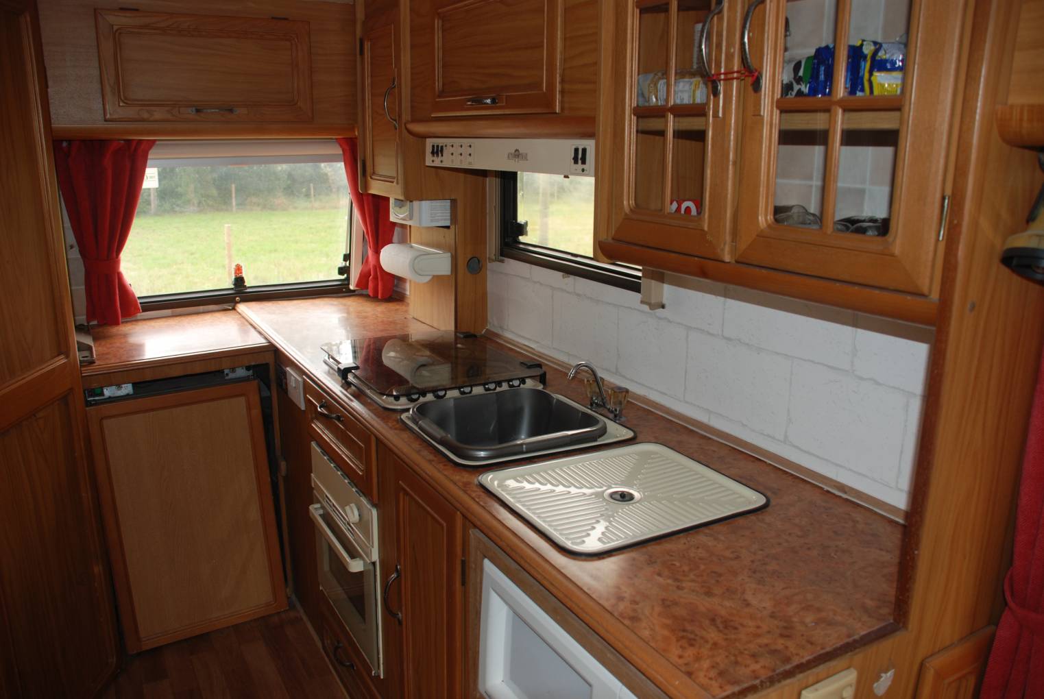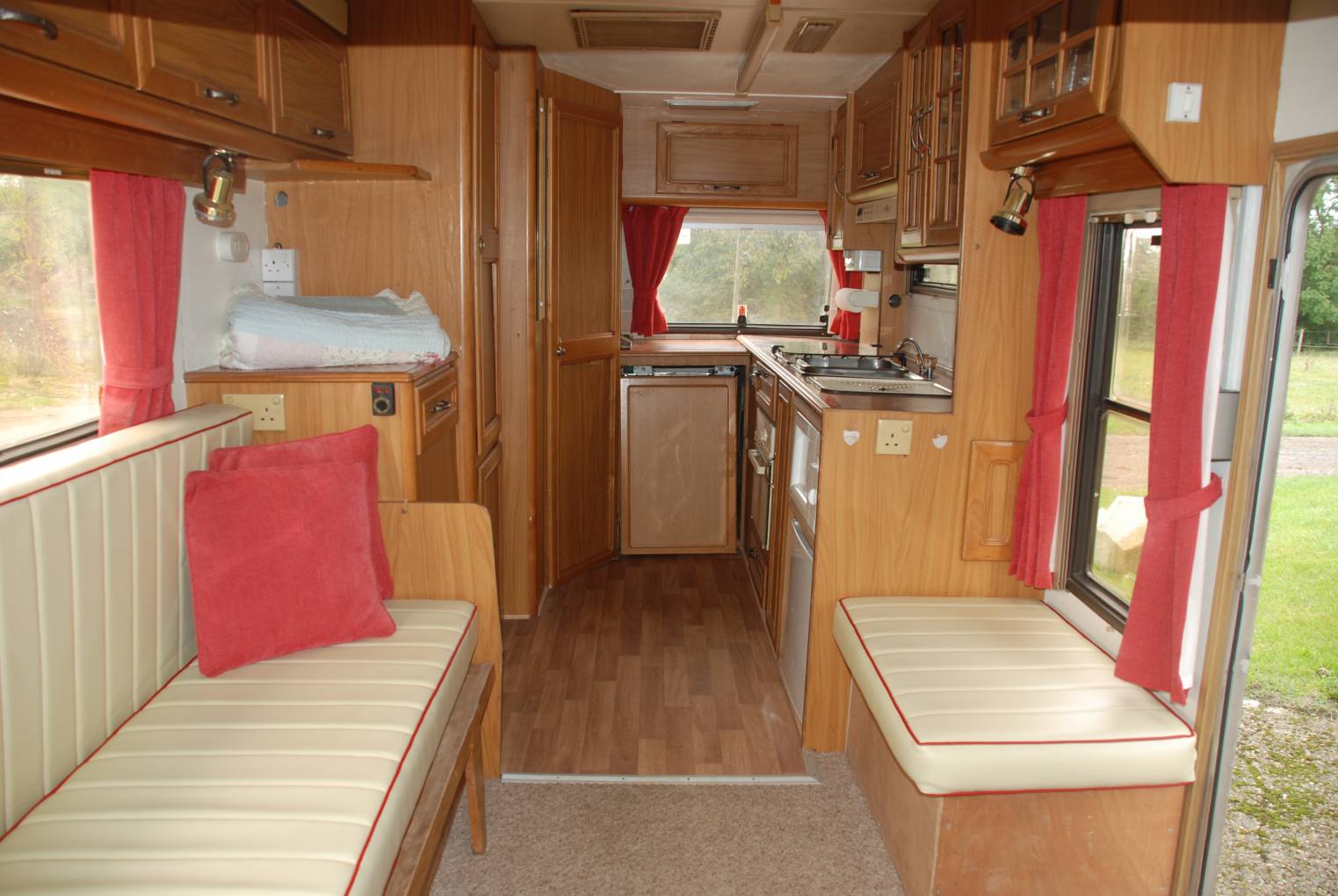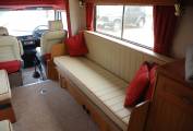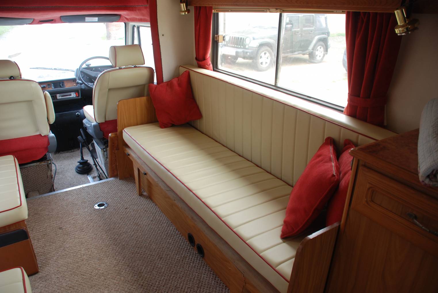 On entering the living area you will find all the seating including driver and passenger seats have been carefully re-upholstered in fetching cream with red piping, faux leather finish. There are corresponding matching red curtains and soft furnishings, together with fresh complimenting carpets. This central area is ready to convert to sleeping accommodation in addition to the over cab double.