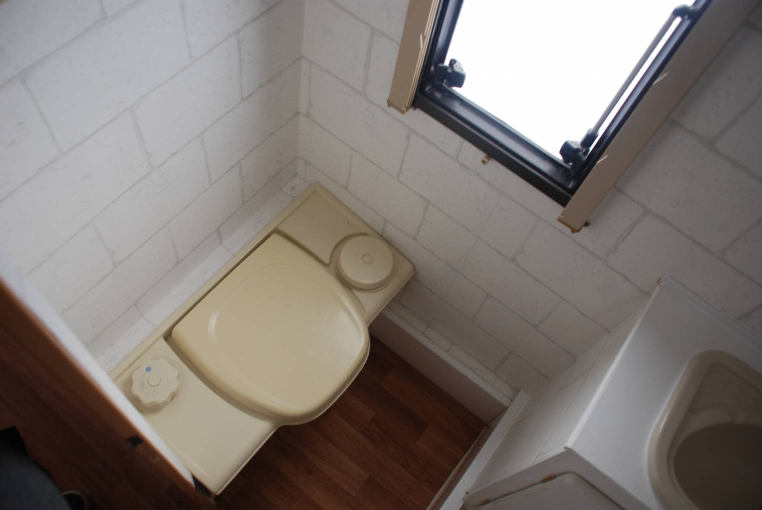 The washroom has a wash basin, toilet and shower, so you can be self sufficient when off grid. Again hot water is fed from the kitchen combi boiler.