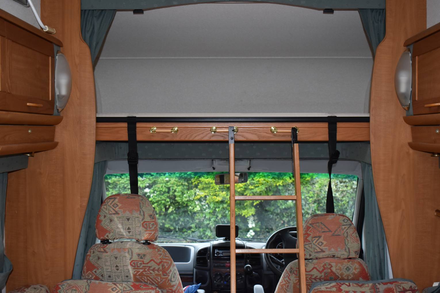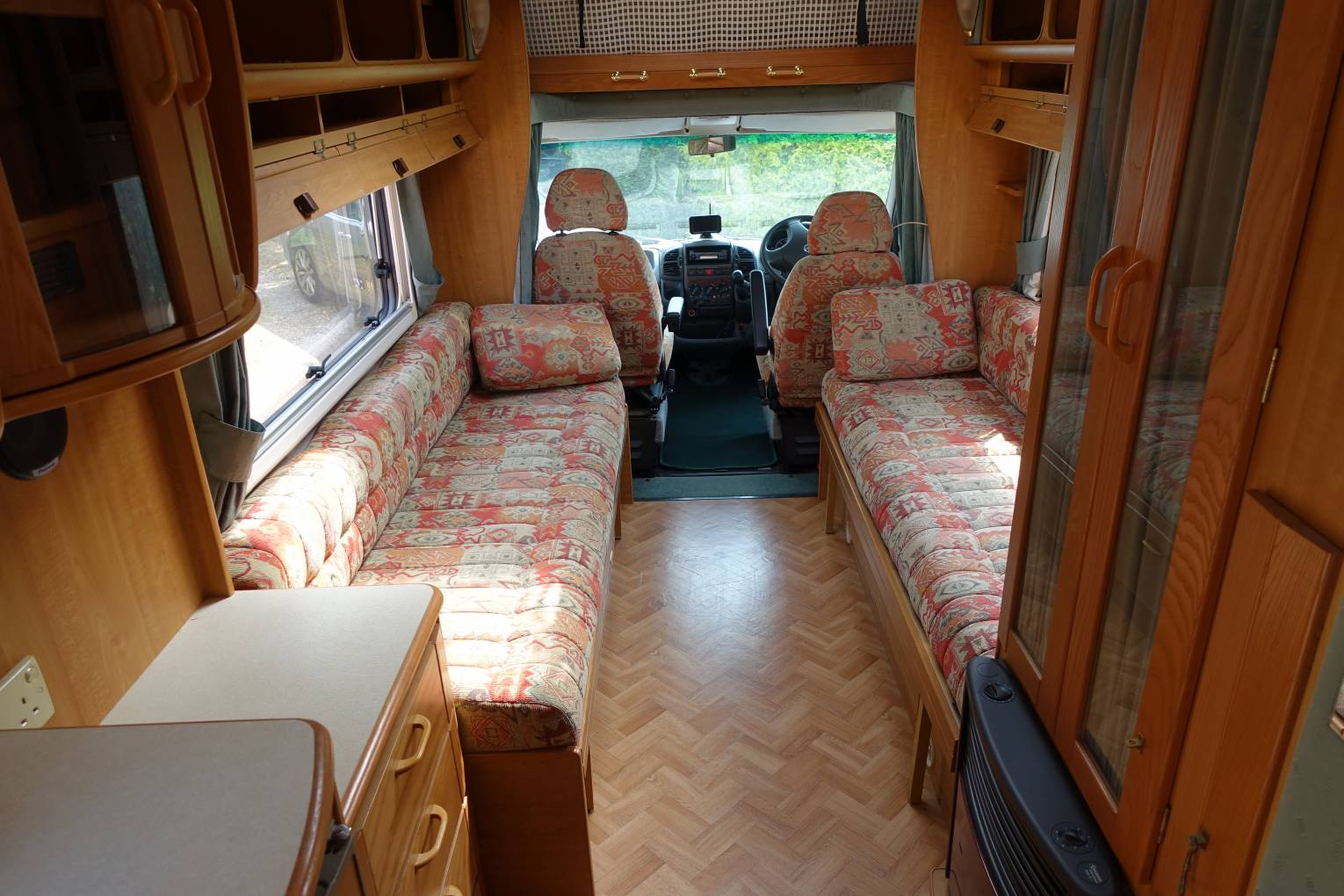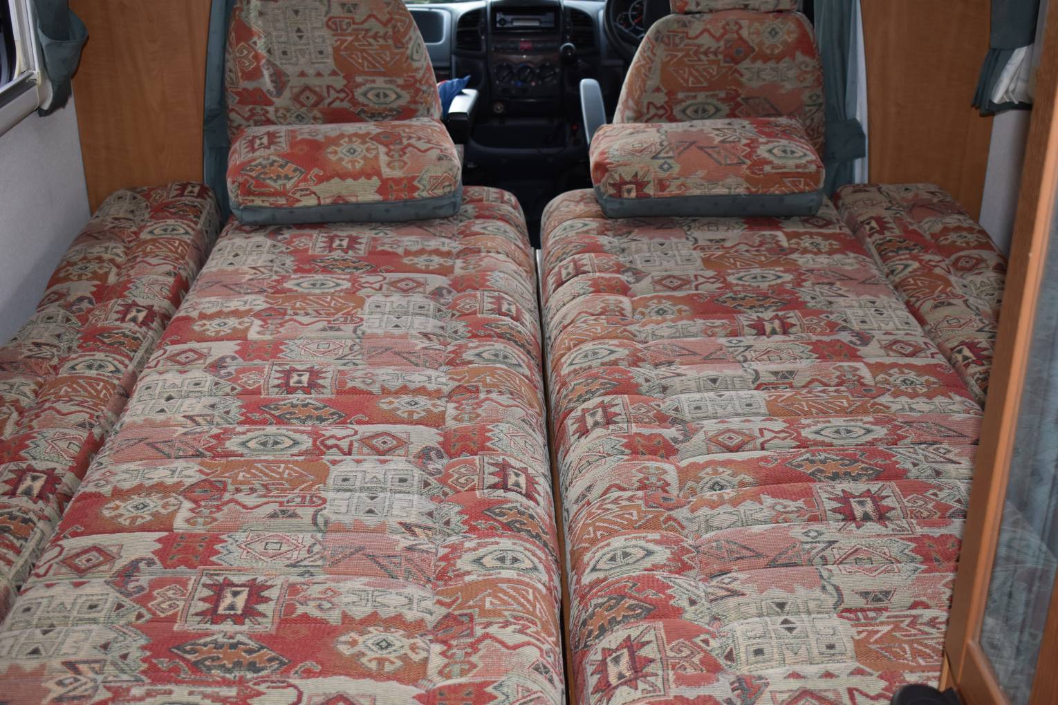 consists of a large over-cab bed with the front-end lounge bench style seats