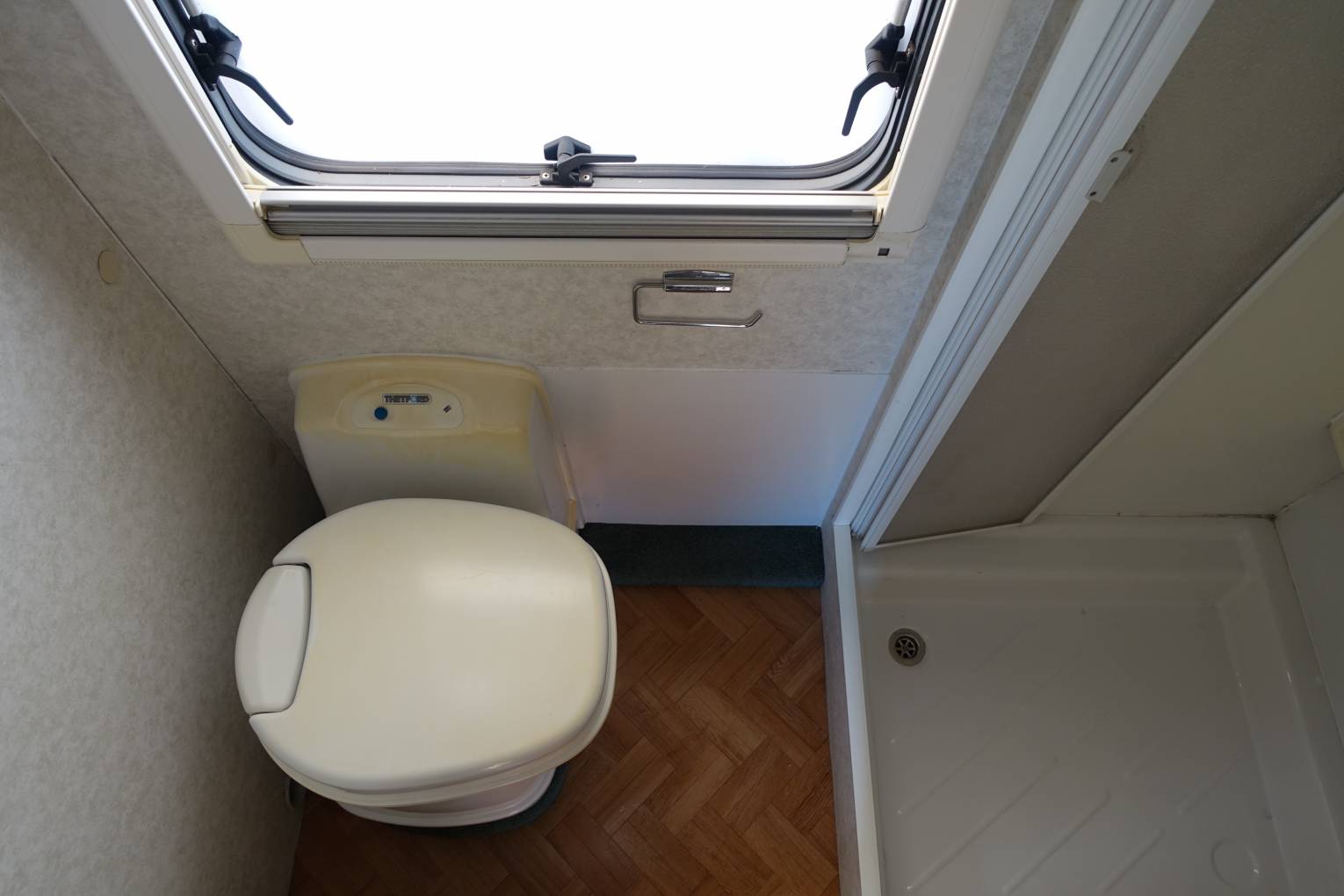 located at the rear which has a separate shower, swivel toilet and a clever