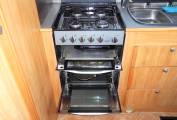 It features the popular end kitchen layout and this area has an oven with grill, a 4 gas burner hob, a 3 way fridge freezer, sink and tap and plenty of cupboard space.