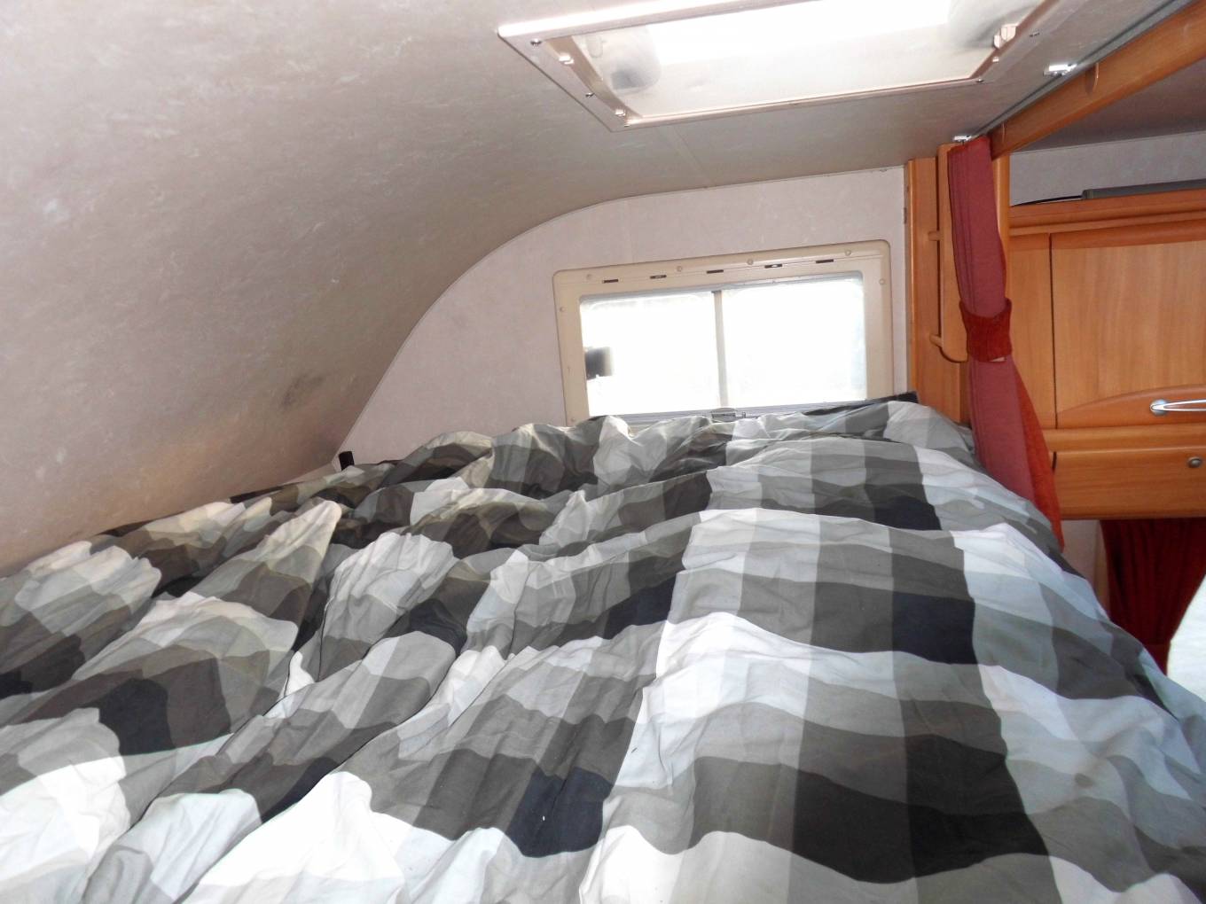 The large over cab bed easily sleeps 2 adults and has a skylight which gives it a nice airy feel. Below is the cab which as you would expect with the Fiat Ducato is nicely laid out and this motorhome is a real joy to drive.