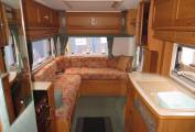 Moving forward you have a galley style kitchen with oven, grill, gas hob with 4 gas burners and microwave oven on one side and 3-way fridge with ice compartment, sink, mixer tap and drainer on the other. The Cheyenne also has plenty of work top and cupboard space making it an ideal motorhome for those who enjoy cooking for themselves whilst away.