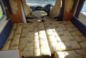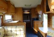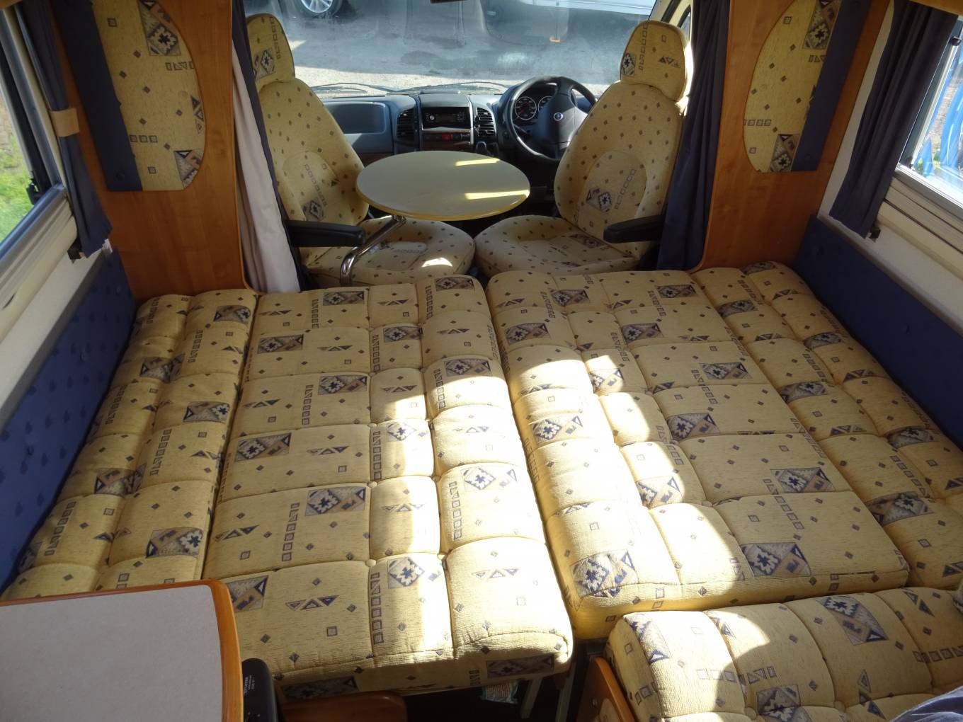 Internally, there really is a huge amount of room, with the front lounge and dinette offering enough space for at least 6 people + another 2 in the swivelling Captains chairs. The seating converts into a double bed if required and also has a swivelling table - very handy for the drinks cabinet! The storage is fantastic, with three cupboards over the front cab (one very large) and twin lockers virtually going the full length of the inside, including one with power that would easily take a microwave if required.