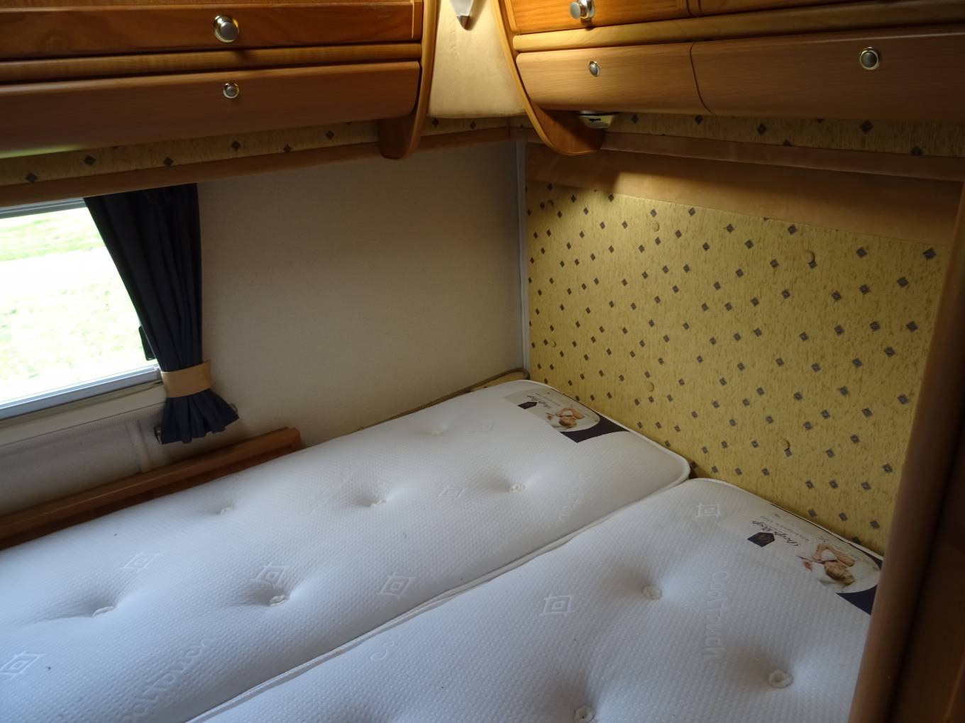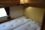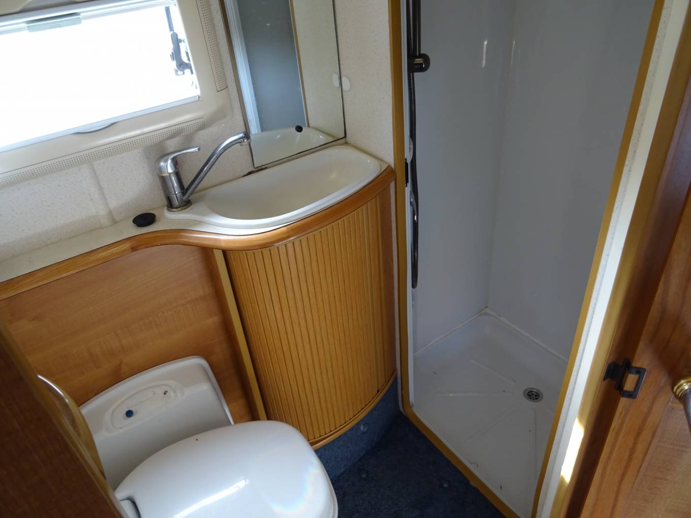 Going to the rear of the vehicle, the washroom has a separate shower, cassette toilet and vanity unit with storage underneath. Coming out of the washroom there is a wardrobe with drawers, a transverse double bed that again benefits from many cupboards above - there is also access into the garage below.