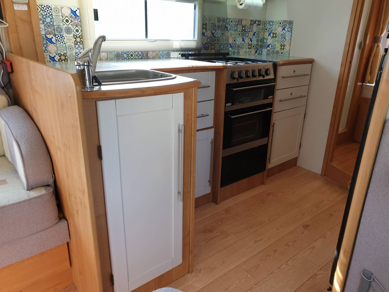 the motorhome. Next, the kitchen, has a 3-gas burner and one electric hob; oven