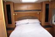 To the rear of the vehicle the master bedroom with a fixed island double bed, wardrobes and drawers to either side, ottoman storage underneath the bed, reading lights and Tv.