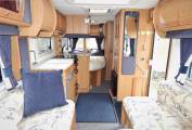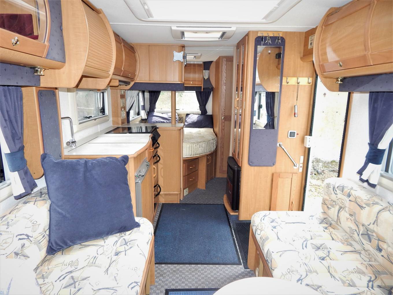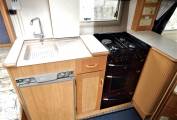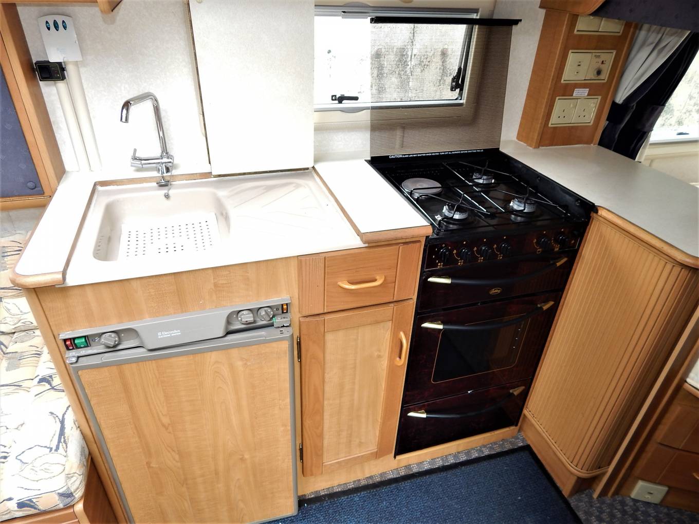 Kitchen - immediately opposite the habitation door, consists of a single sink drainer with chrome mixer tap, a full size cooker with oven and grill, above a 3 gas and one electric burner hob. There is also a well proportioned Dometic absorber fridge with ice box, which can be powered by 240v, 12v, or gas depending whether plugged in on site or wild camping.