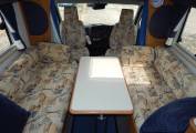 Lounge - We enter the motorhome on the near side via an electric step immediately to the left is the front lounge area which consists of twin opposing sofas, there is a small side table for occasional use or a large free standing table that stows away over the cab while not in use. The front seats also rotate to join this area so you could easily sit 6 people around the table when entertaining on site. The sofas will pull together at night to form an additional double bed.
