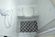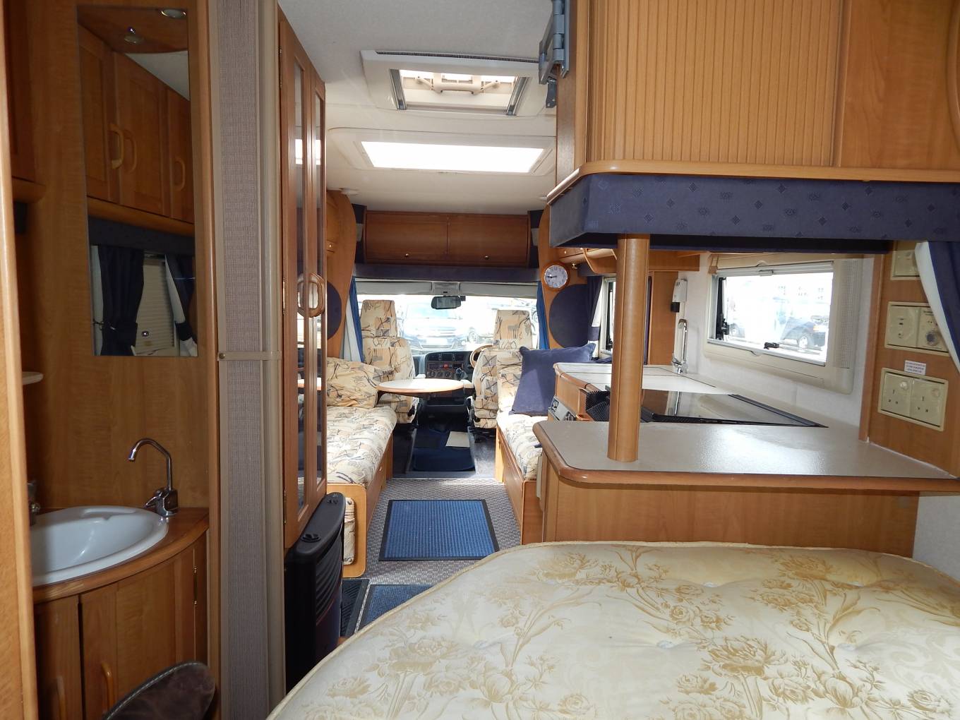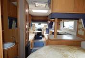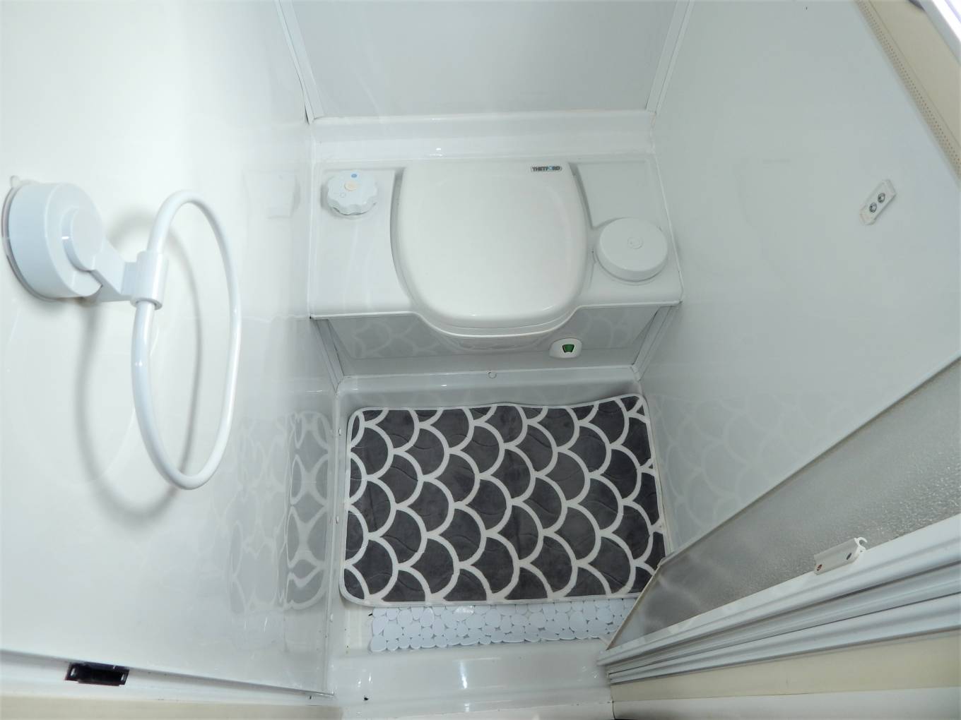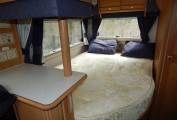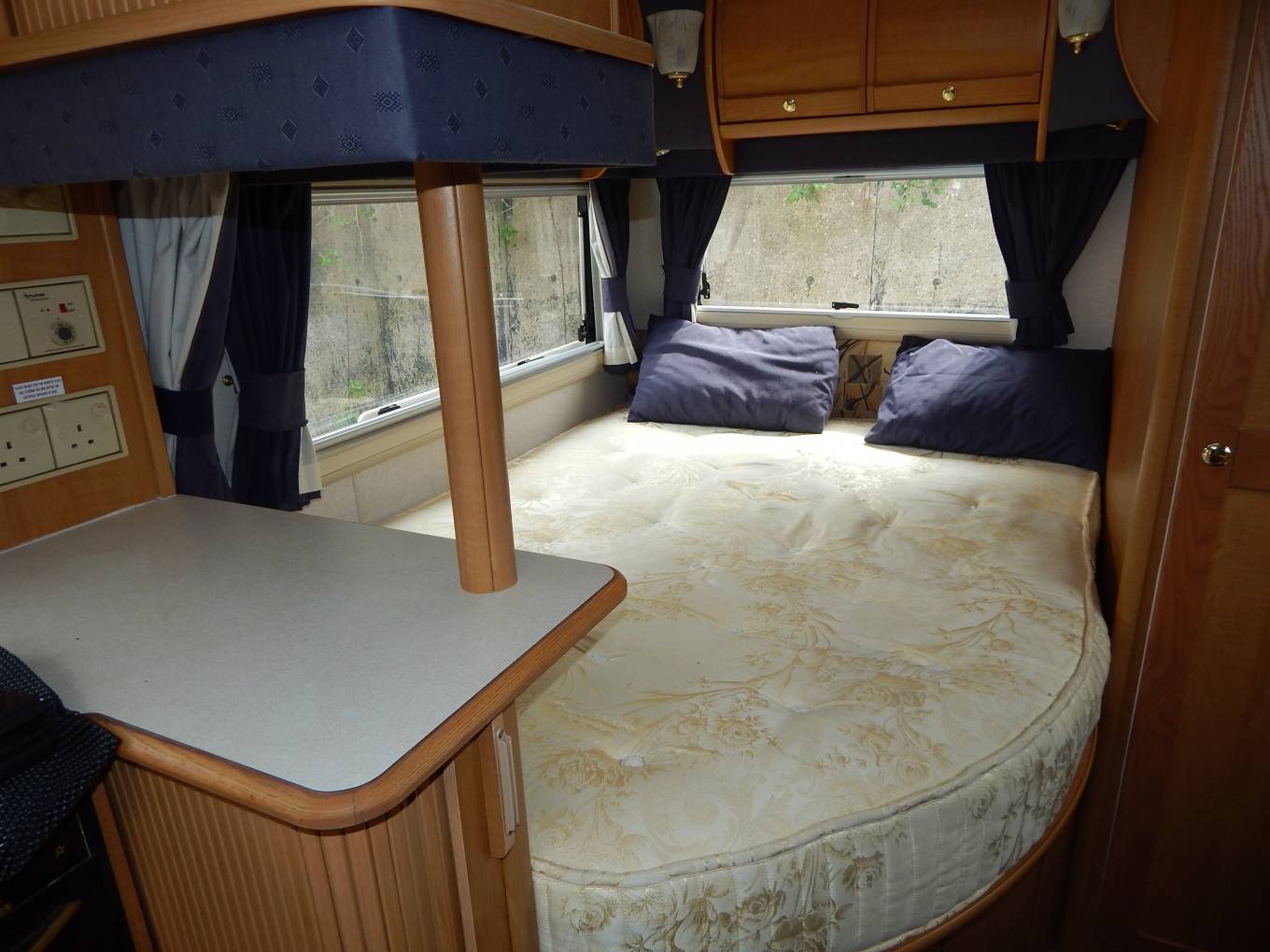 Main Bed - a fixed French bed which can be lifted to access the under bed storage, to the side of the bed is a wetroom style Bathroom which consist of a Thetford fresh water flush casette toilette, to the front is the shower whith perspex doors to close. The sink a white enamel style hand basin with chrome mixer tap is situated in a dressing area just to the front of the bathroom.