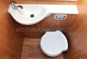 Opposite is a large double door hanging wardrobe over the Thetford heater. Moving rear again on the drivers side is a large bathroom with a Thetford Swivel head fresh water flush cassette toilet with built in white sink above with chrome mixer tap above. Opposite is a separate shower cubicle that can be closed off with Perspex folding doors.