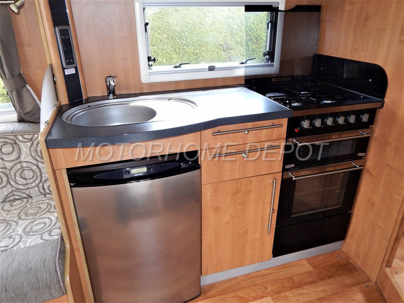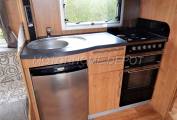 Moving rear is the galley style kitchen which consists of a large brushed metal oval sink and drainer with chrome mixer tap, a 4 burner dual fuel hob, 3 gas and one 240v electric for when you are plugged in on site. Below is a full size oven and grill. There is plenty of cupboard space for all your cooking utensils and a Microwave oven also for use on site. Under the counter is a Thetford fully automatic absorber fridge freezer. This can be powered by 240v, 12v or gas depending if you are wild camping or plugged into the mains.