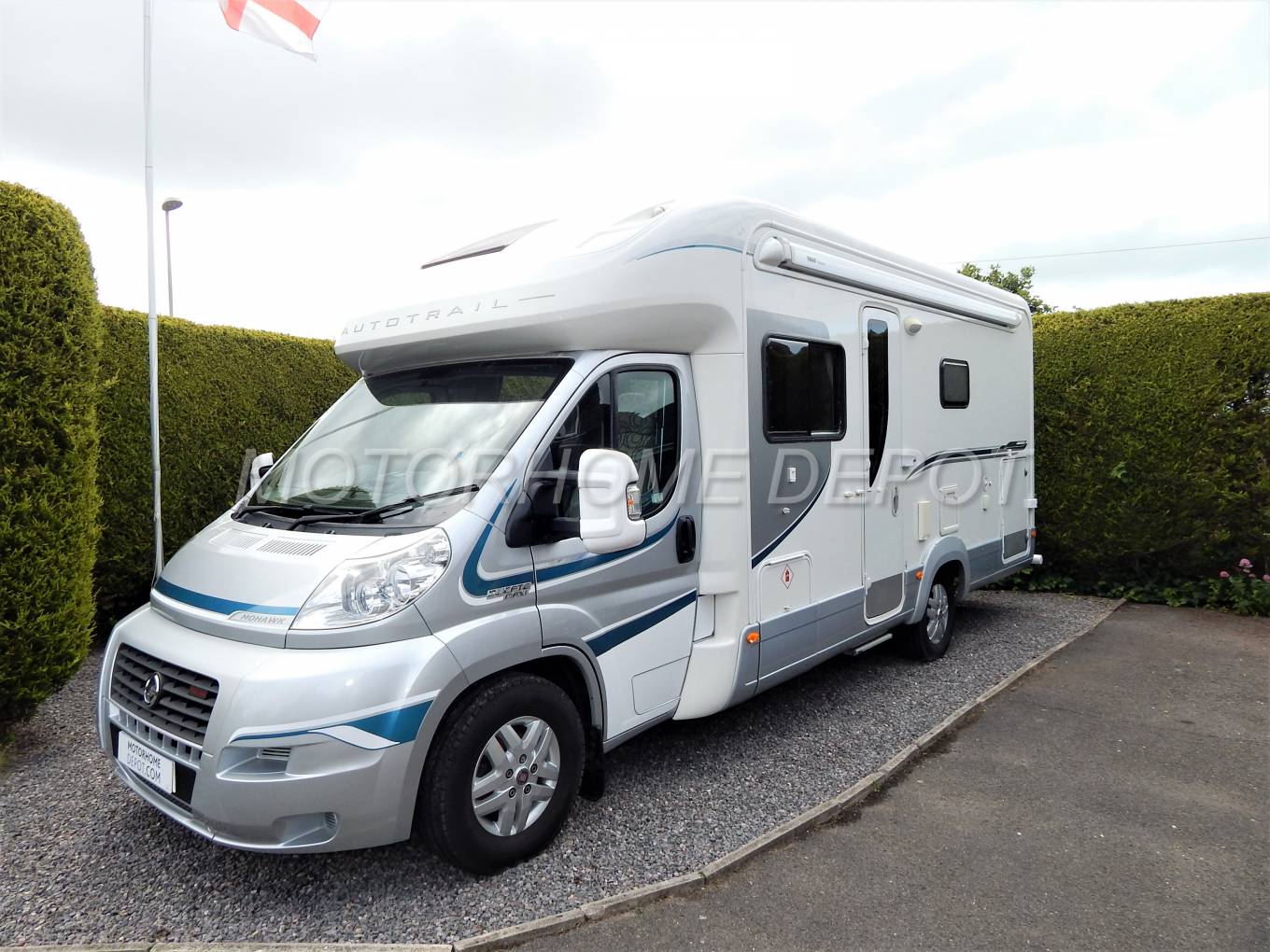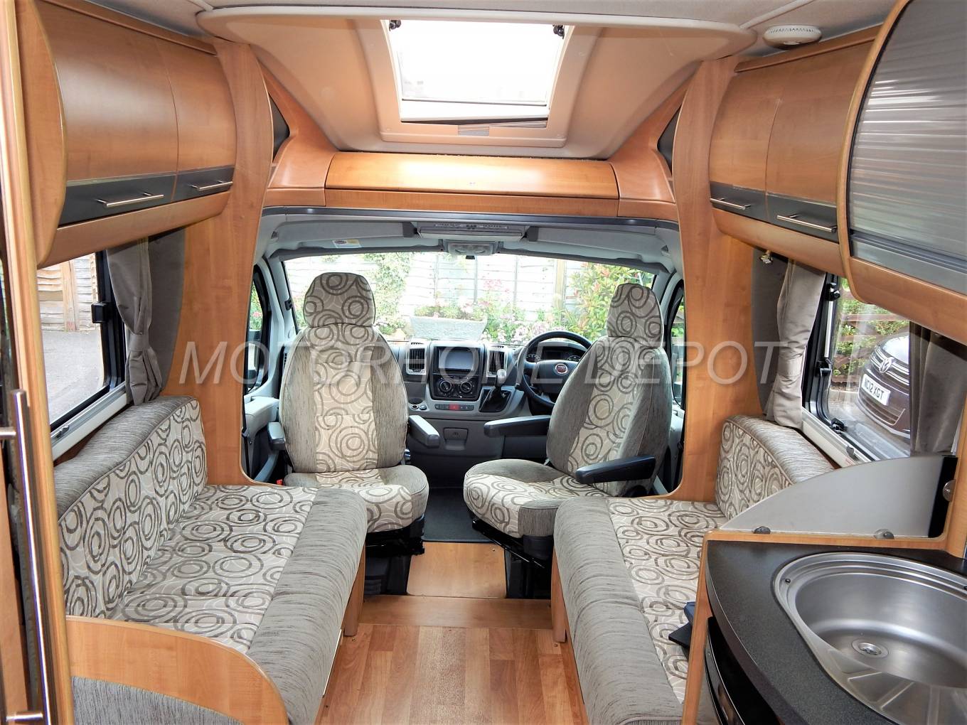 A rare model of this popular Auto-Trail Frontier Mohawk, being the Super Low Line Edition built on the ever popular Fiat Ducato chassis with the 3.0 turbo diesel engine in the 160 BHP with a 6 speed Comformatic Automatic gearbox. The chassis is the heavy option and has a GVW of 4250KG. It has only covered 24684 miles from new and has a comprehensive service history comprising of 5 services in the book the last having been carried out in 10/18 at 18204 miles. The current MOT expires in 10/20 and has no advisories, a Habitation check is booked for the 19/06 to bring it up to date. The cab benefits from: Cab Air conditioning; Electric Front Windows; Electric Heated Mirrors; Cruise Control; Multi Media package including, 15” Drop down colour TV monitor, Built in entertainment system featuring 7” touch screen Radio/CD/DVD player, Integral TV/Radio digital receiver, SD card reader, aux – for MP3/iPod, Colour infra red reversing camera. There are Remis blinds to the front and side windows.