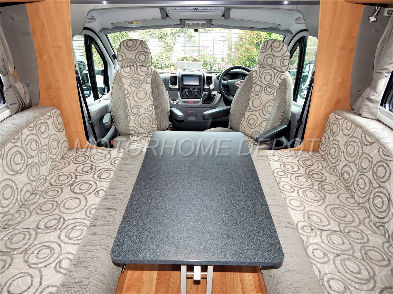 We enter the Motorhome on the passenger side via an electric step immediately to the left is the lounge area which consists of two large opposing sofas. The front two seats rotate to join this area so you could easily seat 8 if entertaining on site. There is a large dining table that is free standing and folds away to be stored in a cupboard when not in use. This area pulls together to form a large double bed at night using a combination of the sofa cushions as the mattress.