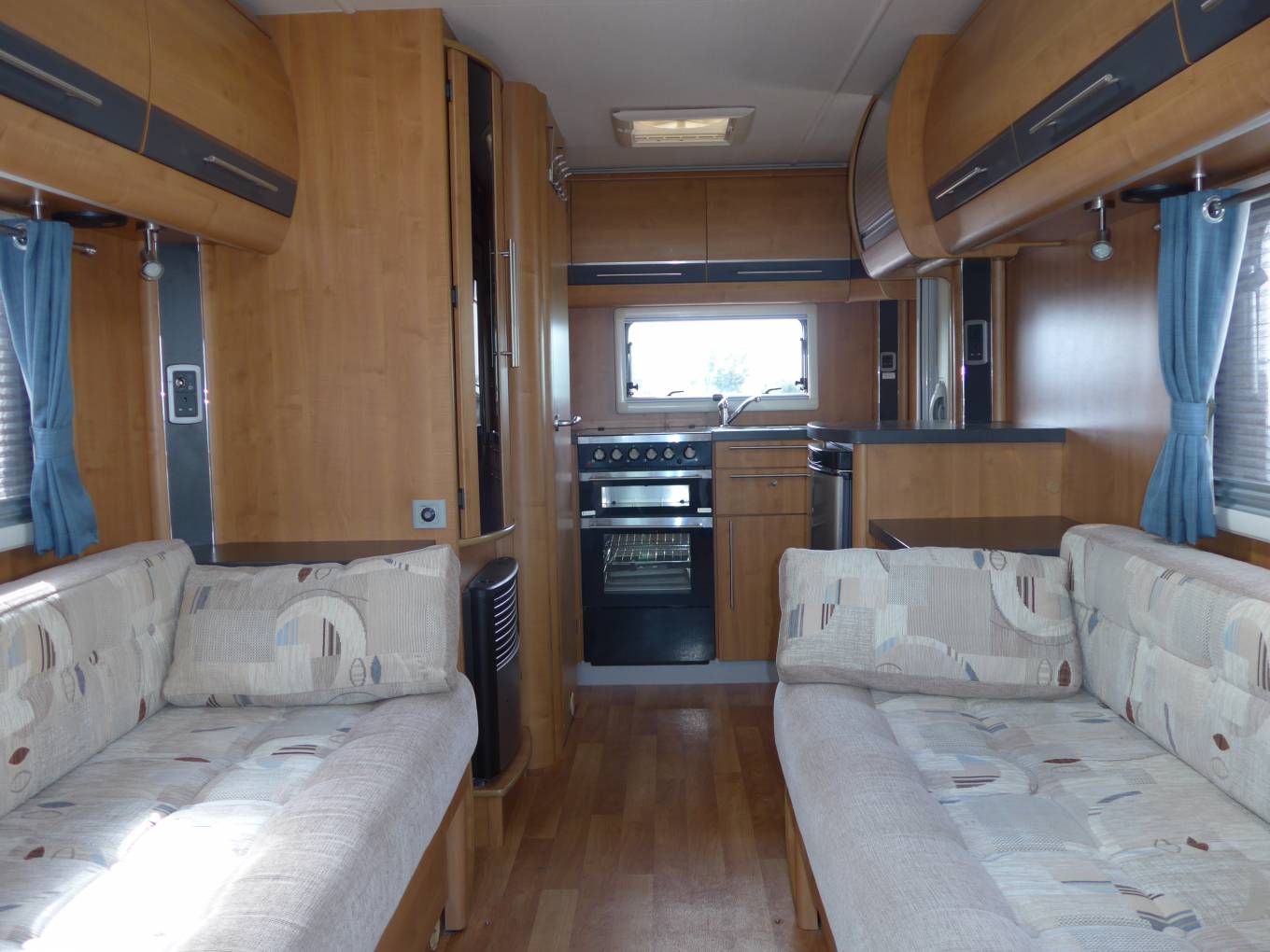 Washroom with Separate Shower enclosure, Washbasin Vanity cabinet, mirror and cassette toilet. Two long comfortable side sofa’s which make up into a large double or two generous single beds.
