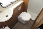 At the very back of the motorhome you have an exceptionally comfortable fixed French bed so no need to keep making the bed up each day. The front sofas also come together to make an additional double bed if required. There is a good sized washroom at the rear with Thetford flush cassette toilet, vanity sink and separate shower. The motorhome has heating and hotwater from the Truma Ultrastore and Ultraheat system working on both gas and electric. It has LED lighting throughout.