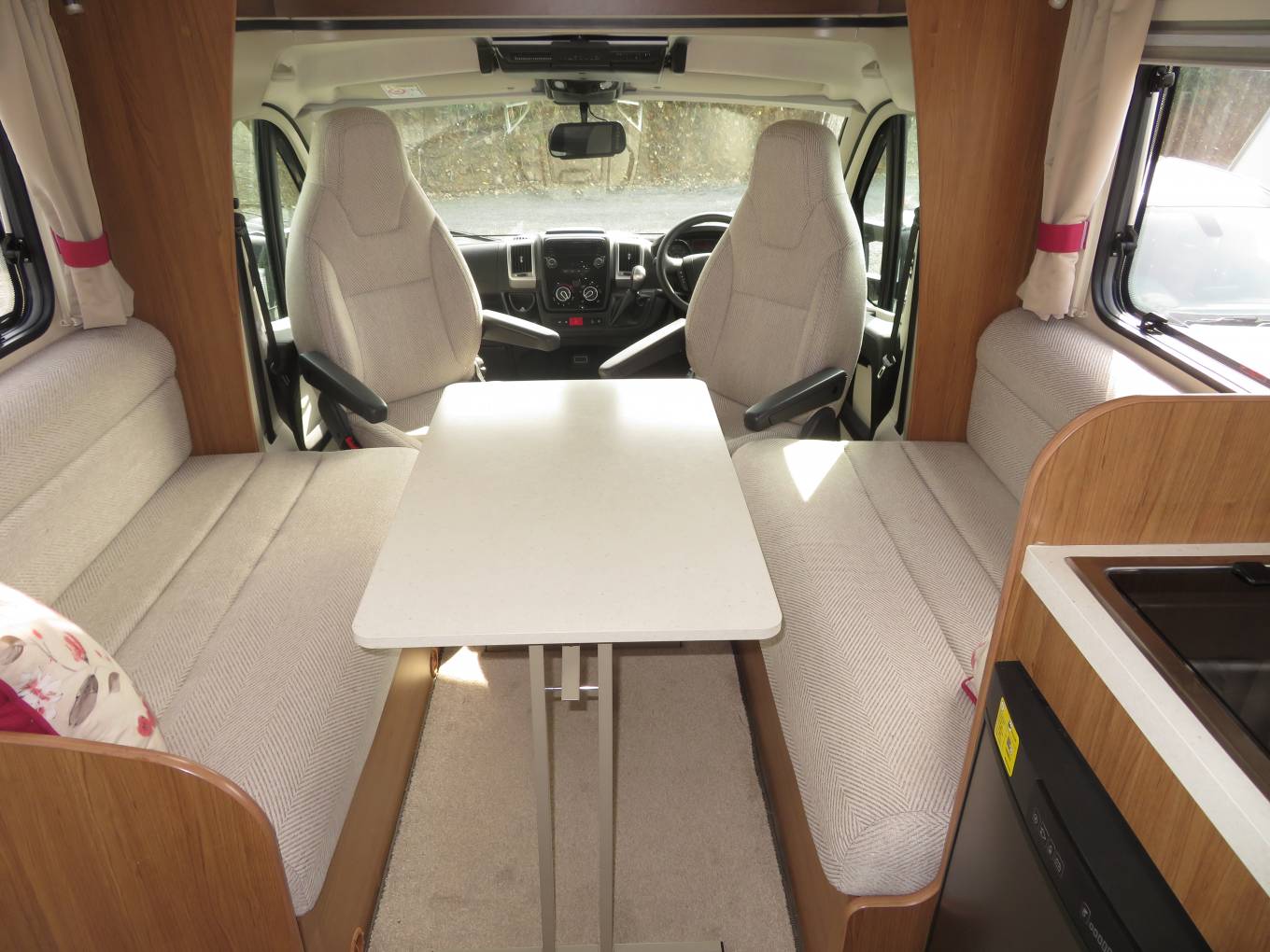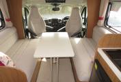 At the front of the motorhome you have a great lounge area which comprises of two side facing double sofas and the front two captains chairs that can be swivelled around. This creates the perfect area to put your feet up and relax. It has a folding table that can be put up in the centre to create the ideal space to enjoy a meal or snack, or put away when not in use.