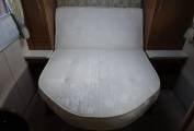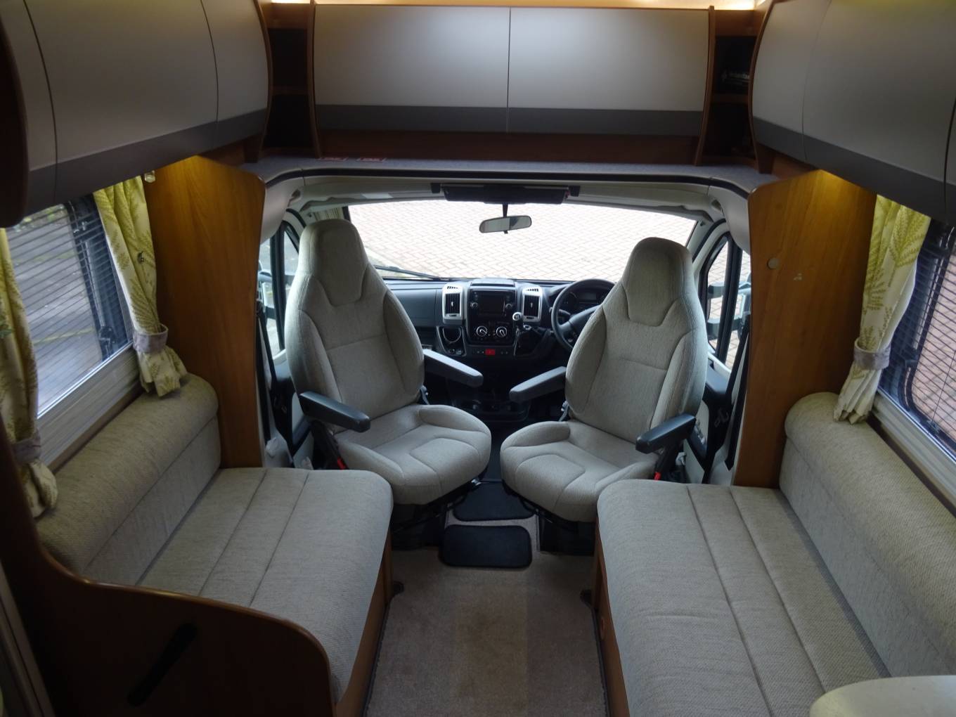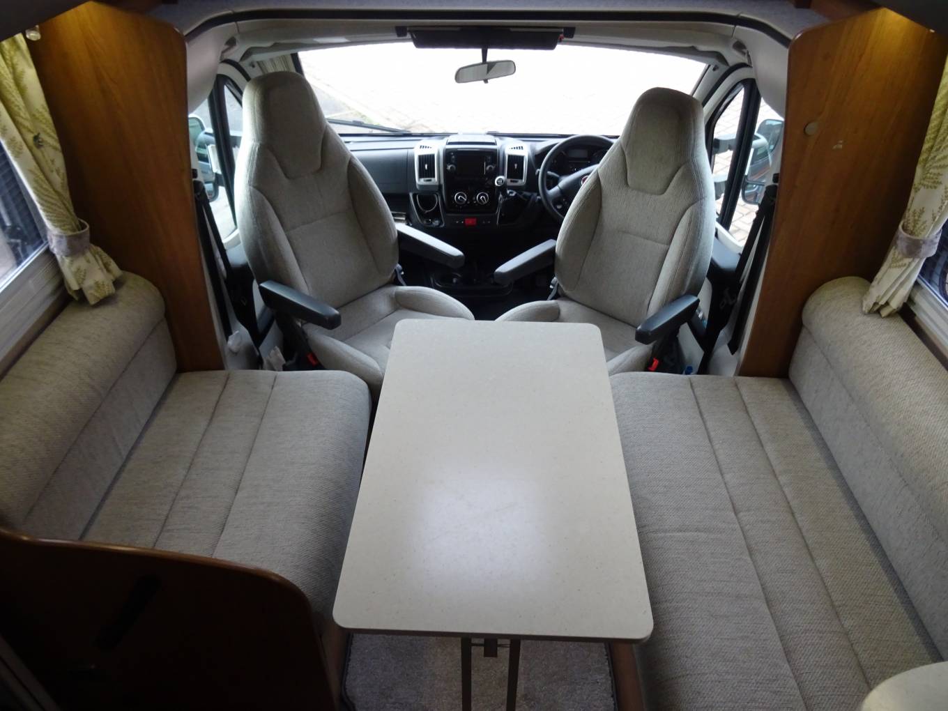 Moving down we have a parallel lounge set up with a double sofa facing a single. Both lift up to give good storage, and pull out to very easily make a double bed. The cab seats swivel round to make for a comfortable lounge. There is a table for a dinette. Choice of 2 TV's (1 drop down above cab) with a Maxview satellite.