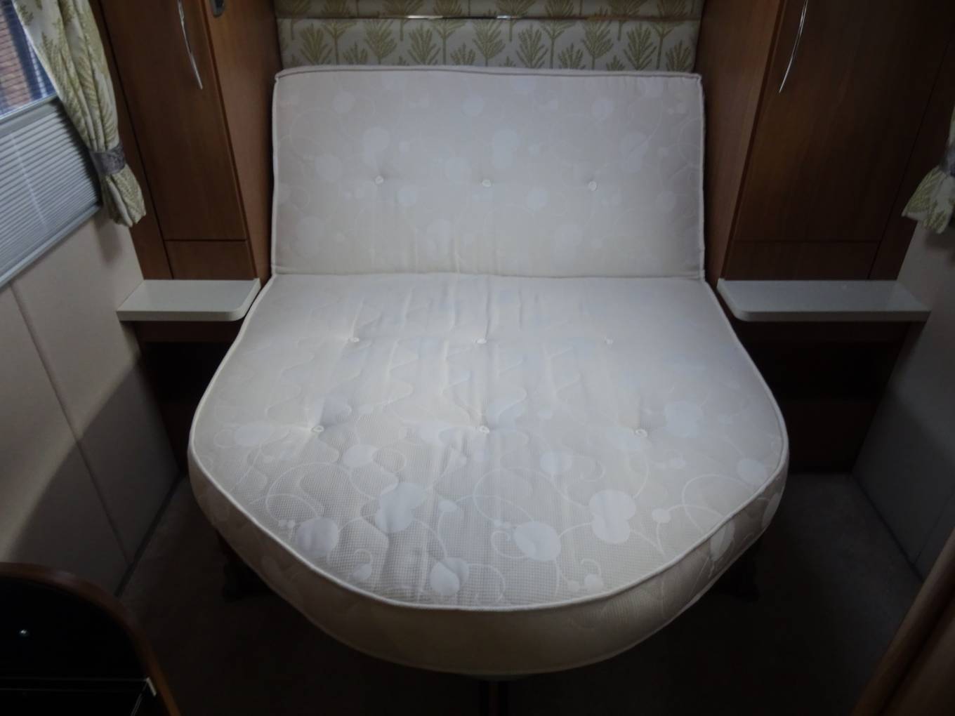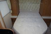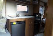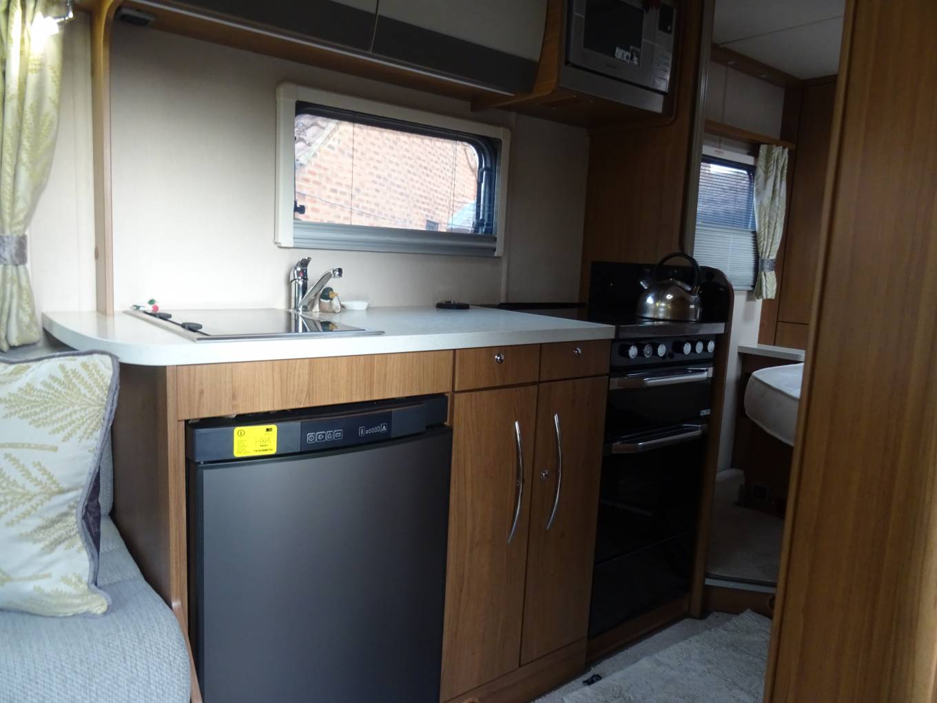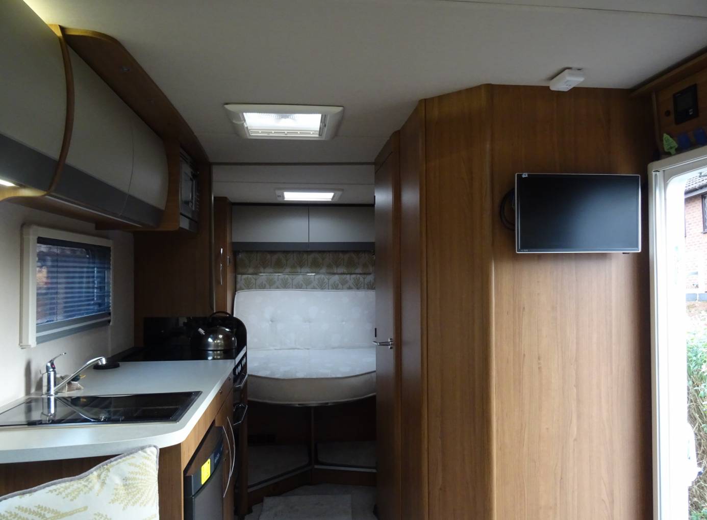 The kitchen has a great prep area, large sink, 1 electric hot plate and 3 gas hob burners, Thetford gas cooker, and grill. There is a pull up stalk with three 240 sockets, microwave and a good size 3 way Dometic fridge with freezer box.