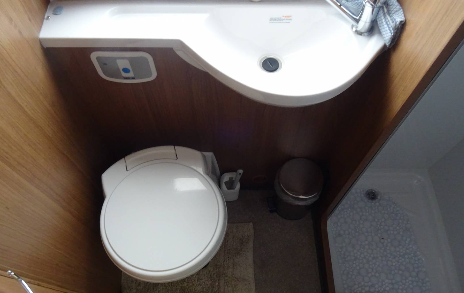The washroom is the typical Auto trail modern set up and has everything you need - lighting, sink, cupboard, toilet, mirror, and large shower with a bi-fold door.