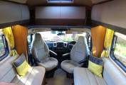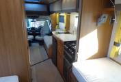 The layout from the front to rear is parallel lounge/diner - long galley kitchen with facing washroom - rear bedroom with twin singles. Both cab seats swivel, making for a very comfortable lounge/diner with facing sofas, stored away table and a large sky light. There are overhead side lockers and the above cab area has been allocated 2 more. There is more storage under the sofas. There is a drop down TV/DVD linked to a satellite system. A bed can be easily made up in this area.